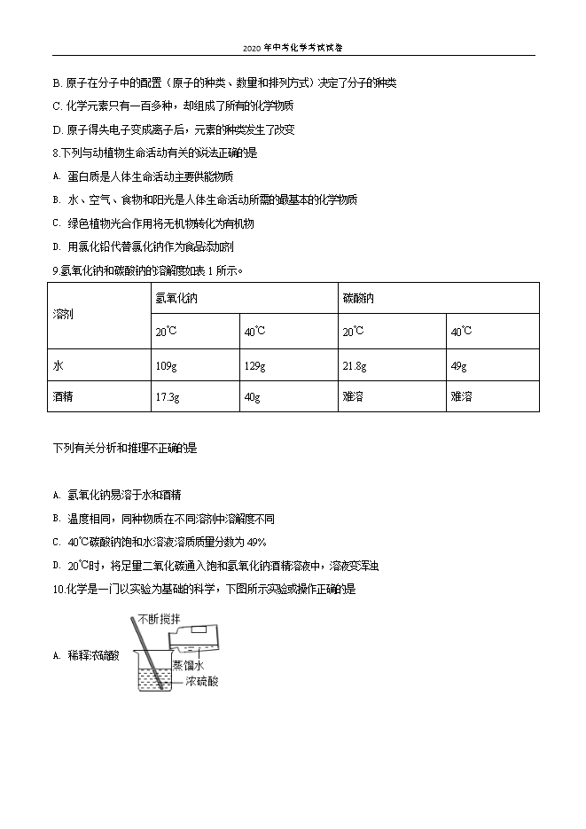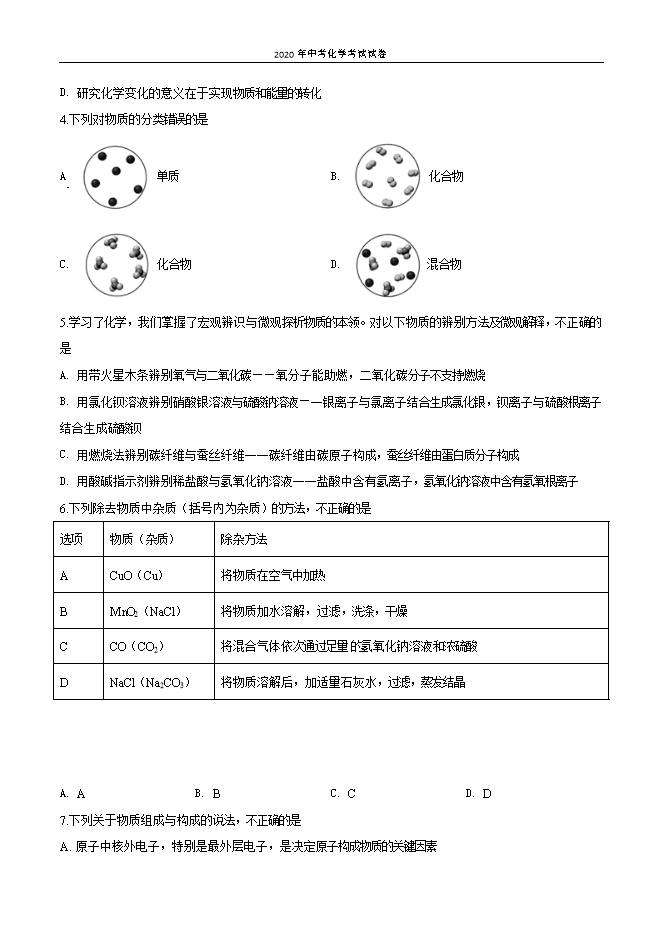 【内容简介】一、选择(本题包括10小题,每小题2分,共20分。每小题只有一个选项符合题意)1.下列过程主要发生化学变化 是A. 用水银温度计测量体温B. 用消毒液对环境进行消毒C. 佩戴口罩预防疾病传染D. 教室和宿舍经常通风2.垃圾分类投放已成为新时尚。某同学清理教室时收集到如下垃圾:①废纸 ②铝制易拉罐 ③废口罩 ④矿泉水瓶 ⑤废电池,应投入图1所示标志垃圾箱的是 A ①②④B. ①②③④C. ①②③⑤D. ①②③④⑤3.下列对物质变化的认识不正确的是A. 在物理变化中分子的能量、间隔、相互作用均不变B. 水的天然循环只发生物理变化C. 物质能否发生化学变化是由构成物质的微粒决定的D. 研究化学变化的意义在于实现物质和能量的转化4.下列对物质的分类错误的是A 单质B. 化合物C. 化合物D. 混合物5.学习了化学,我们掌握了宏观辨识与微观探析物质的本领。对以下物质的辨别方法及微观解释,不正确的是A. 用带火星木条辨别氧气与二氧化碳——氧分子能助燃,二氧化碳分子不支持燃烧B. 用氯化钡溶液辨别硝酸银溶液与硫酸钠溶液—一银离子与氯离子结合生成氯化银,钡离子与硫酸根离子结合生成硫酸钡C. 用燃烧法辨别碳纤维与蚕丝纤维一一碳纤维由碳原子构成,蚕丝纤维由蛋白质分子构成D. 用酸碱指示剂辨别稀盐酸与氢氧化钠溶液一一盐酸中含有氢离子,氢氧化钠溶液中含有氢氧根离子6.下列除去物质中杂质(括号内为杂质)的方法,不正确的是......