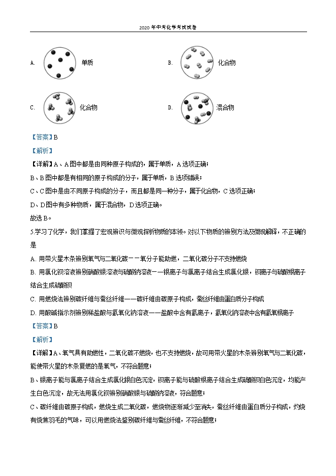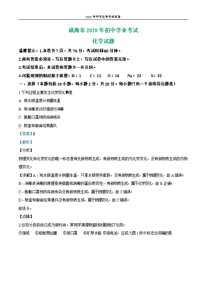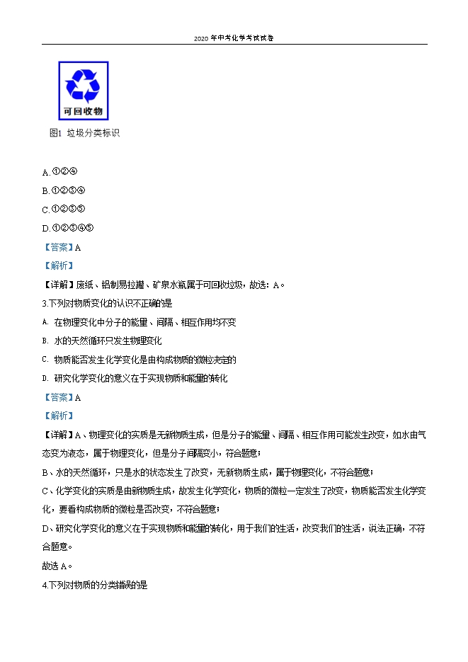 【内容简介】一、选择(本题包括10小题,每小题2分,共20分。每小题只有一个选项符合题意)1.下列过程主要发生化学变化 是A. 用水银温度计测量体温B. 用消毒液对环境进行消毒C. 佩戴口罩预防疾病传染D. 教室和宿舍经常通风【答案】B【解析】【分析】物理变化和化学变化的唯一标志是有无新物质生成,有新物质生成的为化学变化,没有新物质生成的为物理变化。【详解】A、用水银温度计测量体温,只是水银受热膨胀,没有新物质生成,属于物理变化,故A错误;B、消毒液消毒的原理是使细菌或病毒的蛋白质变性,有新物质生成,属于化学变化,故B正确;C、佩戴口罩预防疾病传染没有新物质生成,属于物理变化,故C错误;D、教室和宿舍经常通风没有新物质生成,属于物理变化,故C错误;故选B。【点睛】2.垃圾分类投放已成为新时尚。某同学清理教室时收集到如下垃圾:①废纸 ②铝制易拉罐 ③废口罩 ④矿泉水瓶 ⑤废电池,应投入图1所示标志垃圾箱的是 A. ①②④B. ①②③④C. ①②③⑤D. ①②③④⑤【答案】A【解析】【详解】废纸、铝制易拉罐、矿泉水瓶属于可回收垃圾,故选:A。3.下列对物质变化的认识不正确的是A. 在物理变化中分子的能量、间隔、相互作用均不变B. 水的天然循环只发生物理变化C. 物质能否发生化学变化是由构成物质的微粒决定的D. 研究化学变化的意义在于实现物质和能量的转化【答案】A【解析】......