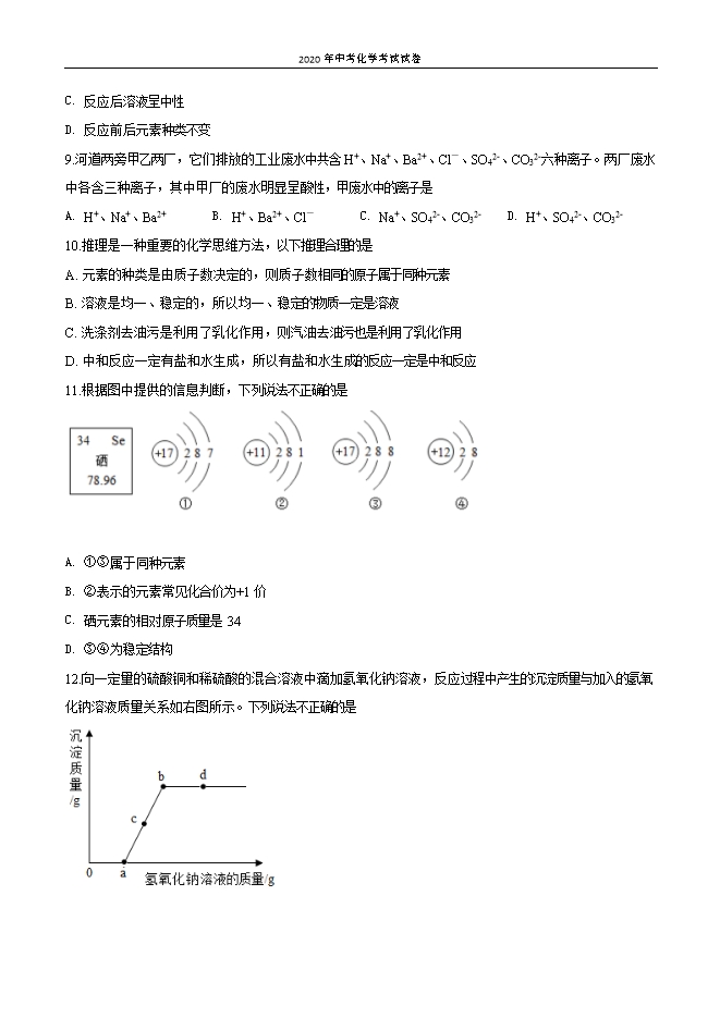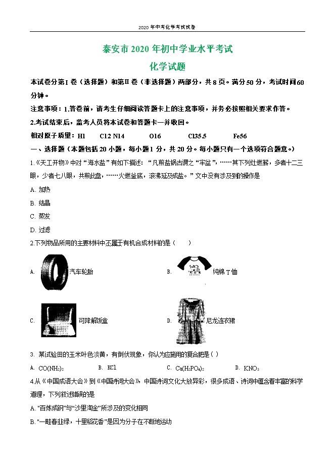 山东省泰安市2020年初中毕业学业统一考试化学试卷(原卷版)