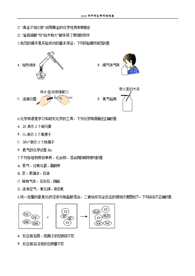 【内容简介】一、选择题(本题包括20小题,每小题1分,共20分。每小题只有一个选项符合题意。)1.《天工开物》中对“海水盐”有如下描述:“凡煎盐锅古谓之“牢盆”,……其下列灶燃薪,多者十二三眼,少者七八眼,共煎此盘,……火燃釜底,滚沸延及成盐。”文中没有涉及到的操作是A. 加热B. 结晶C. 蒸发D. 过滤2.下列物品所用的主要材料中不属于有机合成材料的是( )A. 汽车轮胎B. 纯棉T恤C. 可降解饭盒D. 尼龙连衣裙3. 某试验田的玉米叶色淡黄,有倒伏现象,你认为应施用的复合肥是( )A. CO(NH2)2B. KClC. Ca(H2PO4)2D. KNO34.从《中国成语大会》到《中国诗词大会》,中国诗词文化大放异彩,很多成语、诗词中蕴含着丰富的科学道理,下列叙述错误的是A. "百炼成钢”与“沙里淘金”所涉及的变化相同B. "一畦春韭绿,十里稻花香”是因为分子在不断地运动C. "真金不怕火炼”说明黄金的化学性质非常稳定D. "釜底抽薪”与“钻木取火”都体现了燃烧的条件5.规范的操作是实验成功的基本保证,下列实验操作规范的是......