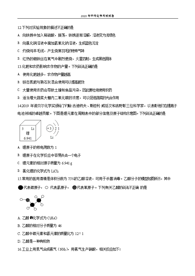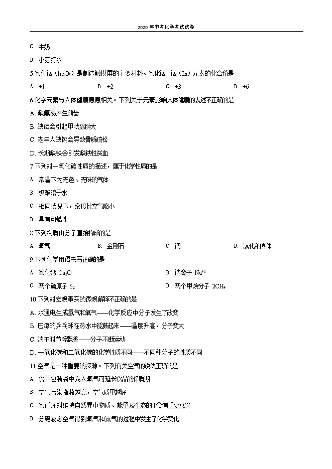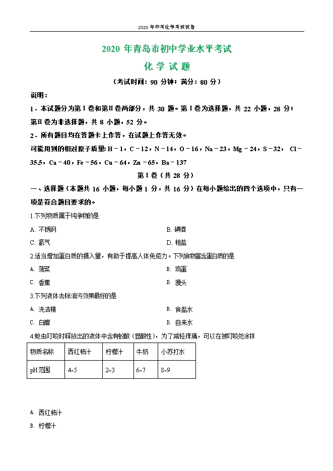 山东省青岛市2020年初中毕业学业统一考试化学试卷(原卷版)