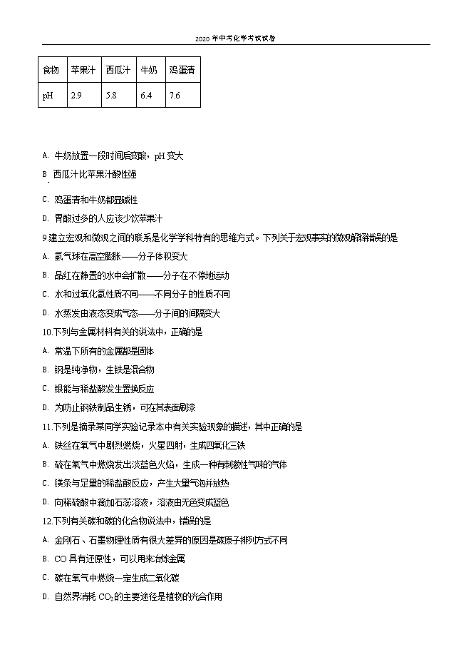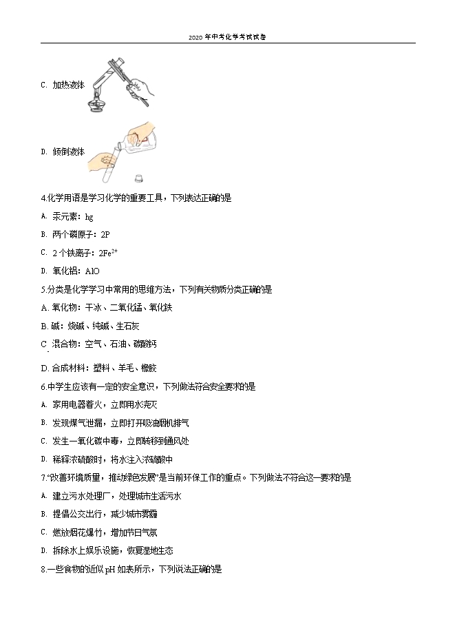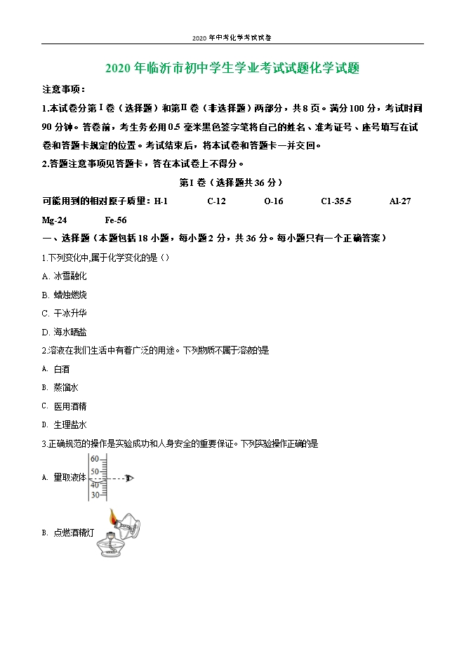 山东省临沂市2020年初中毕业学业统一考试化学试卷(原卷版)