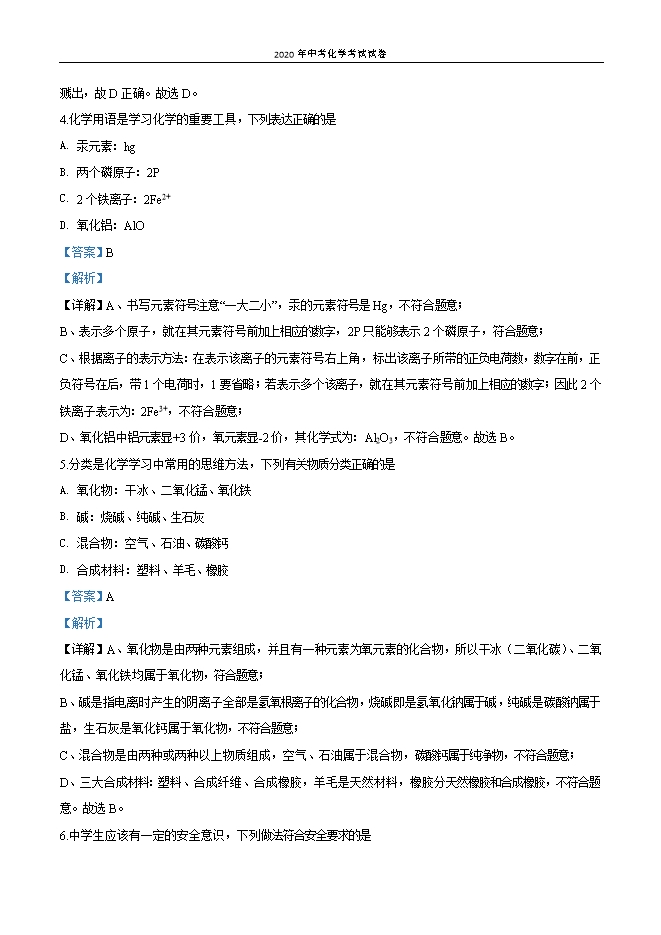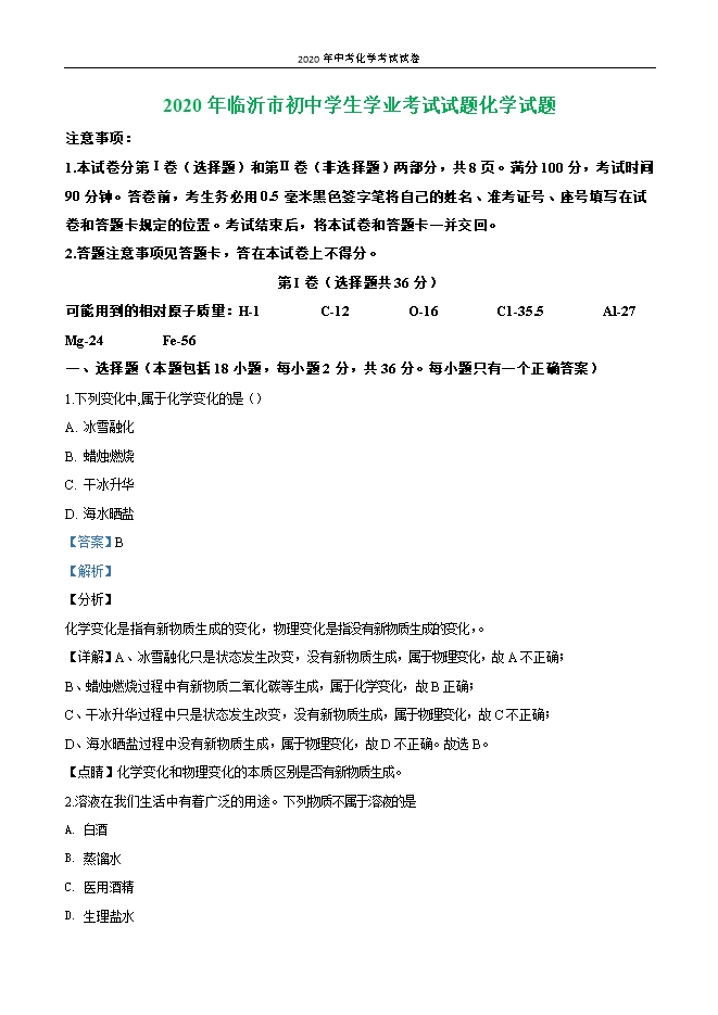 山东省临沂市2020年初中毕业学业统一考试化学试卷(解析版)