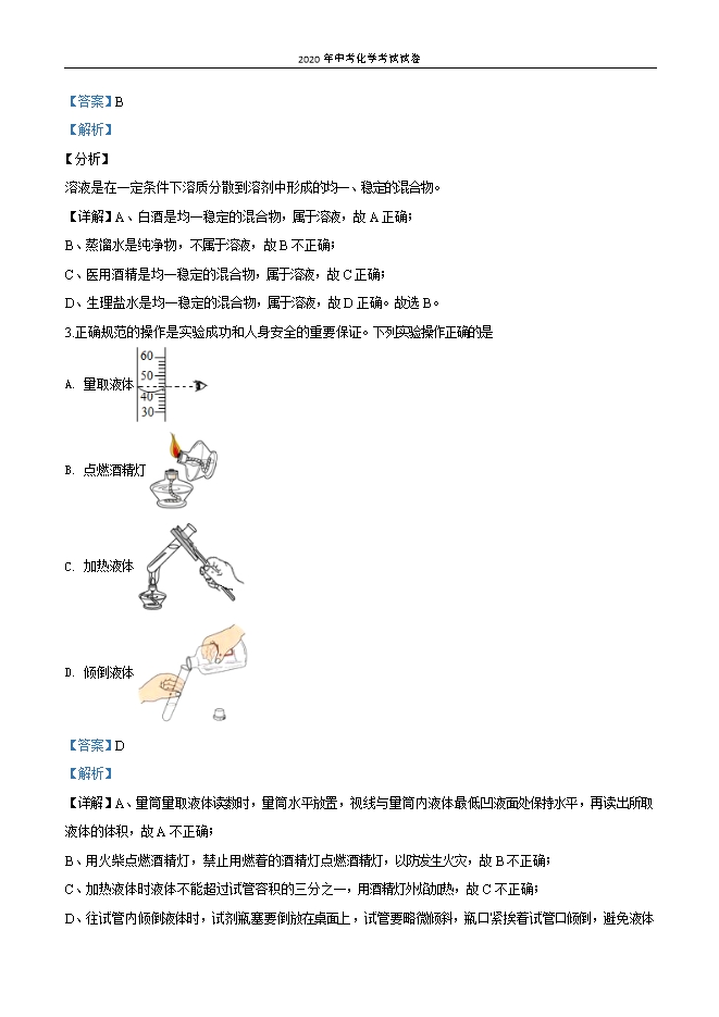 【内容简介】一、选择题(本题包括18小题,每小题2分,共36分。每小题只有一个正确答案)1.下列变化中,属于化学变化的是()A. 冰雪融化B. 蜡烛燃烧C. 干冰升华D. 海水晒盐【答案】B【解析】【分析】化学变化是指有新物质生成的变化,物理变化是指没有新物质生成的变化,。【详解】A、冰雪融化只是状态发生改变,没有新物质生成,属于物理变化,故A不正确;B、蜡烛燃烧过程中有新物质二氧化碳等生成,属于化学变化,故B正确;C、干冰升华过程中只是状态发生改变,没有新物质生成,属于物理变化,故C不正确;D、海水晒盐过程中没有新物质生成,属于物理变化,故D不正确。故选B。【点睛】化学变化和物理变化的本质区别是否有新物质生成。2.溶液在我们生活中有着广泛的用途。下列物质不属于溶液的是A. 白酒B. 蒸馏水C. 医用酒精D. 生理盐水【答案】B【解析】 分析】溶液是在一定条件下溶质分散到溶剂中形成的均一、稳定的混合物。【详解】A、白酒是均一稳定的混合物,属于溶液,故A正确;B、蒸馏水是纯净物,不属于溶液,故B不正确;C、医用酒精是均一稳定的混合物,属于溶液,故C正确;D、生理盐水是均一稳定的混合物,属于溶液,故D正确。故选B。3.正确规范的操作是实验成功和人身安全的重要保证。下列实验操作正确的是......