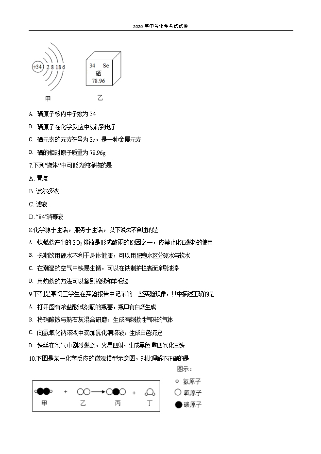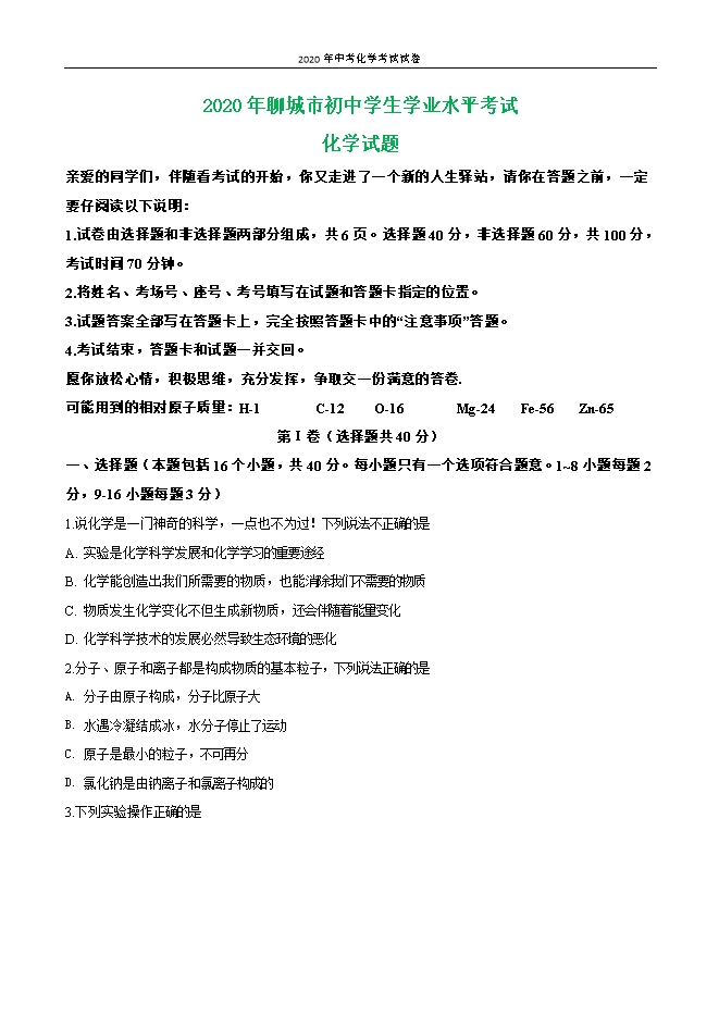 山东省聊城市2020年初中毕业学业统一考试化学试卷(原卷版)