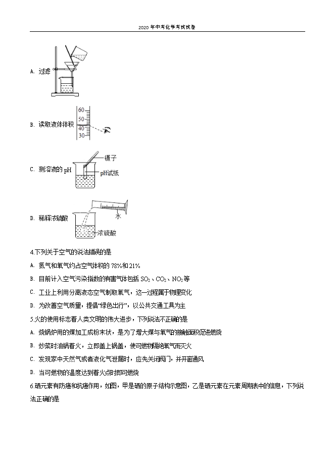 【内容简介】一、选择题(本题包括16个小题,共40分。每小题只有一个选项符合题意。1~8小题每题2分,9-16小题每题3分)1.说化学是一门神奇的科学,一点也不为过!下列说法不正确的是A. 实验是化学科学发展和化学学习的重要途经B. 化学能创造出我们所需要的物质,也能消除我们不需要的物质C. 物质发生化学变化不但生成新物质,还会伴随着能量变化D. 化学科学技术的发展必然导致生态环境的恶化2.分子、原子和离子都是构成物质的基本粒子,下列说法正确的是A. 分子由原子构成,分子比原子大B. 水遇冷凝结成冰,水分子停止了运动C. 原子是最小的粒子,不可再分D. 氯化钠是由钠离子和氯离子构成的3.下列实验操作正确的是A. 过滤 B. 读取液体体积 C. 测溶液的pH D. 稀释浓硫酸 4.下列关于空气的说法错误的是A. 氮气和氧气约占空气体积的78%和21%B. 目前计入空气污染指数的有害气体包括SO2、CO2、NO2等C. 工业上利用分离液态空气制取氧气,这一过程属于物理变化D. 为改善空气质量,提倡“绿色出行”,以公共交通工具为主5.火的使用标志着人类文明的伟大进步,下列说法不正确的是A. 烧锅炉用的煤加工成粉末状,是为了增大煤与氧气的接触面积促进燃烧B. 炒菜时油锅着火,立即盖上锅盖,使可燃物隔绝氧气而灭火C. 发现家中天然气或者液化气泄漏时,应先关闭阀门,并开窗通风......