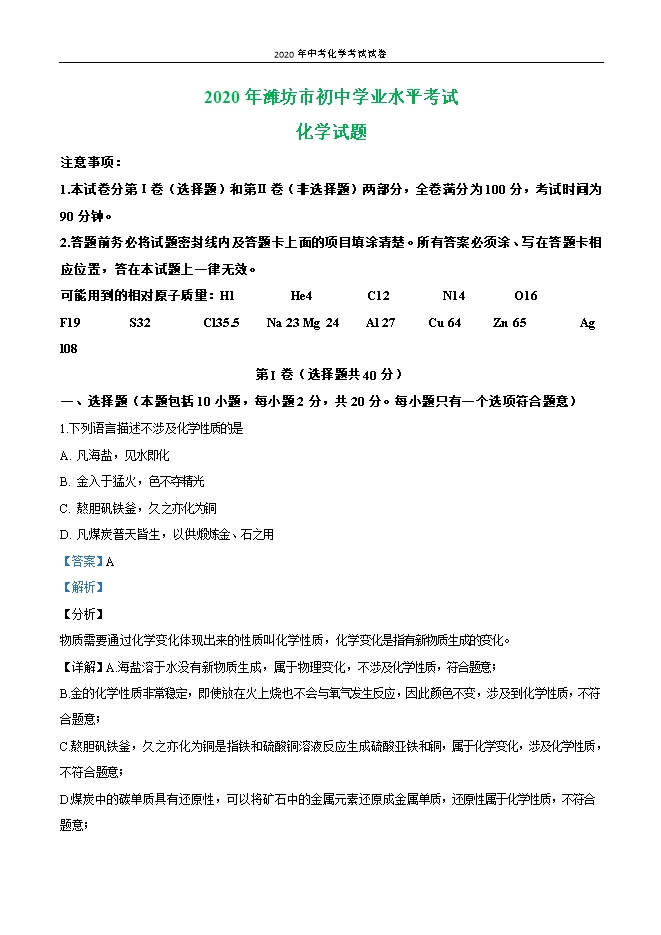 山东省潍坊市2020年初中毕业学业统一考试化学试卷(解析版)