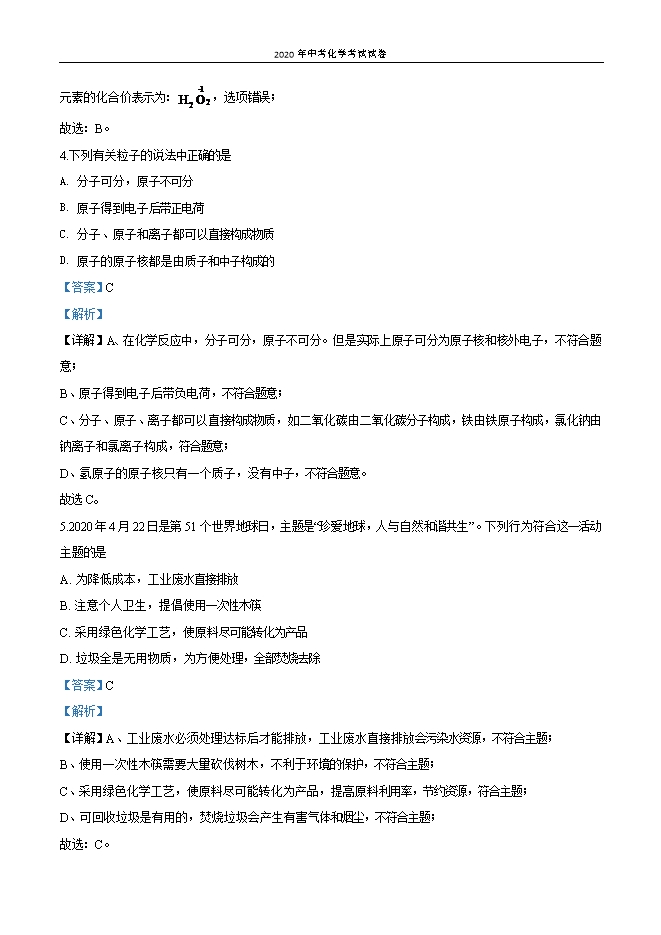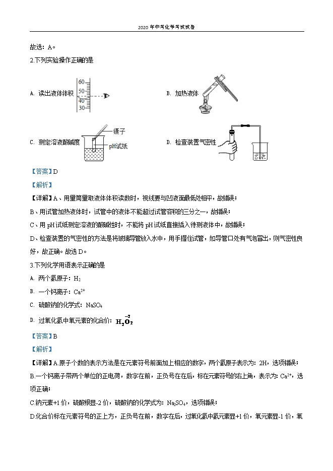【内容简介】一、选择题(本题包括10小题,每小题2分,共20分。每小题只有一个选项符合题意)1.下列语言描述不涉及化学性质的是A. 凡海盐,见水即化B. 金入于猛火,色不夺精光C. 熬胆矾铁釜,久之亦化为铜D. 凡煤炭普天皆生,以供煅炼金、石之用【答案】A【解析】【分析】物质需要通过化学变化体现出来的性质叫化学性质,化学变化是指有新物质生成的变化。【详解】A.海盐溶于水没有新物质生成,属于物理变化,不涉及化学性质,符合题意;B.金的化学性质非常稳定,即使放在火上烧也不会与氧气发生反应,因此颜色不变,涉及到化学性质,不符合题意;C.熬胆矾铁釜,久之亦化为铜是指铁和硫酸铜溶液反应生成硫酸亚铁和铜,属于化学变化,涉及化学性质,不符合题意;D.煤炭中的碳单质具有还原性,可以将矿石中的金属元素还原成金属单质,还原性属于化学性质,不符合题意;故选:A。2.下列实验操作正确的是A. 读出液体体积 B. 加热液体 C. 测定溶液酸碱度 D. 检查装置气密性 【答案】D【解析】【详解】A、用量筒量取液体体积读数时,视线要与凹液面最低处相平,故错误;B、用试管加热液体时,试管中的液体不能超过试管容积的三分之一,故错误;C、用pH试纸测定溶液的酸碱性时,不能将pH试纸直接插入待测液体中,故错误;D、检查装置的气密性的方法是将玻璃导管放入水中,用手握住试管,如导管口处有气泡冒出,则气密性良好,故正确。故选D。3.下列化学用语表示正确的是A. 两个氢原子:H2B. 一个钙离子:Ca2+C. 硫酸钠的化学式:NaSO4D. 过氧化氢中氧元素的化合价: ......