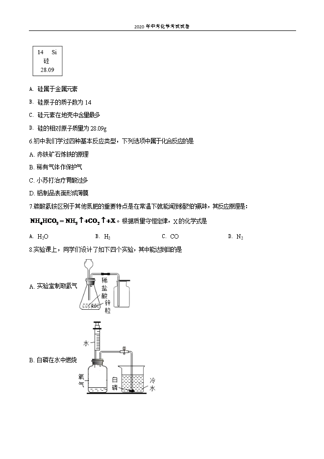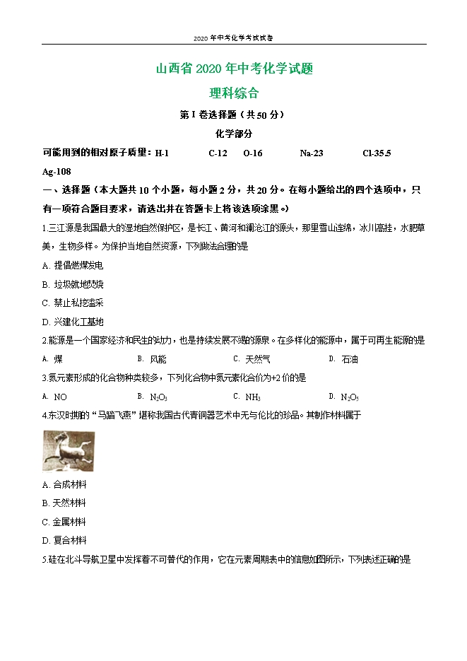 【内容简介】一、选择题(本大题共10个小题,每小题2分,共20分。在每小题给出的四个选项中,只有一项符合题目要求,请选出井在答题卡上将该选项涂黑。)1.三江源是我国最大的湿地自然保护区,是长江、黄河和澜沧江的源头,那里雪山连绵,冰川高挂,水肥草美,生物多样。为保护当地自然资源,下列做法合理的是A. 提倡燃煤发电B. 垃圾就地焚烧C. 禁止私挖滥采D. 兴建化工基地2.能源是一个国家经济和民生的动力,也是持续发展不竭的源泉。在多样化的能源中,属于可再生能源的是A. 煤B. 风能C. 天然气D. 石油3.氮元素形成的化合物种类较多,下列化合物中氮元素化合价为+2价的是A. NOB. N2O3C. NH3D. N2O54.东汉时期的“马踏飞燕”堪称我国古代青铜器艺术中无与伦比的珍品。其制作材料属于 A. 合成材料B. 天然材料C. 金属材料D. 复合材料5.硅在北斗导航卫星中发挥着不可替代的作用,它在元素周期表中的信息如图所示,下列表述正确的是......