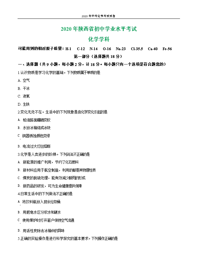 【内容简介】一、选择題(共9小题,每小题2分,计18分。每小题只有一个选项是符合题意的)1.认识物质是学习化学的基础。下列物质属于单质的是A. 空气B. 干冰C. 液氧D. 生铁2.变化无处不在。生活中的下列现象是由化学变化引起的是A. 柏油路面曝晒变软B. 水放冰箱结成冰块C 铜器锈蚀颜色变绿D. 电流过大灯丝熔断3.化学是人类进步的阶梯。下列说法不正确的是A. 新能源的推广利用,节约了化石燃料B. 新材料应用于航空制造,利用的都是其物理性质C. 煤炭的脱硫处理,能有效减少酸雨的形成D. 新药品的研发,可为生命健康提供保障4.日常生活中的下列做法不正确的是A 将饮料瓶放入厨余垃圾桶B. 用肥皂水区分软水和硬水C 使用煤炉时打开窗户保持空气流通D. 用活性炭除去冰箱中的异味5.正确的实验操作是进行科学探究的基本要求。下列操作正确的是......