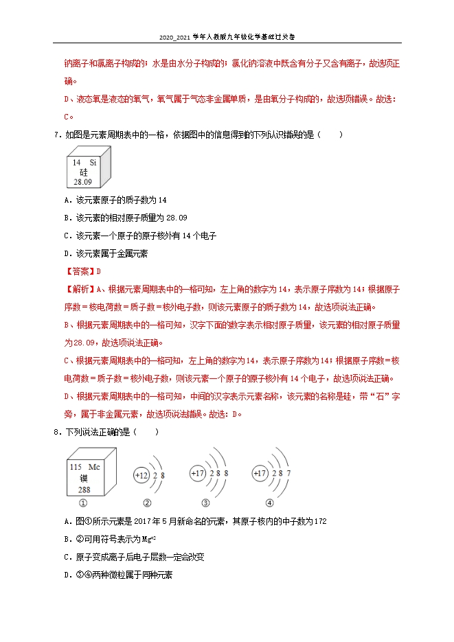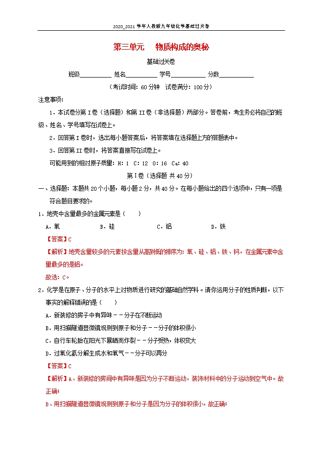 2020_2021学年人教版九年级化学《第三单元 物质构成的奥秘》基础过关卷(word版含答案解析)