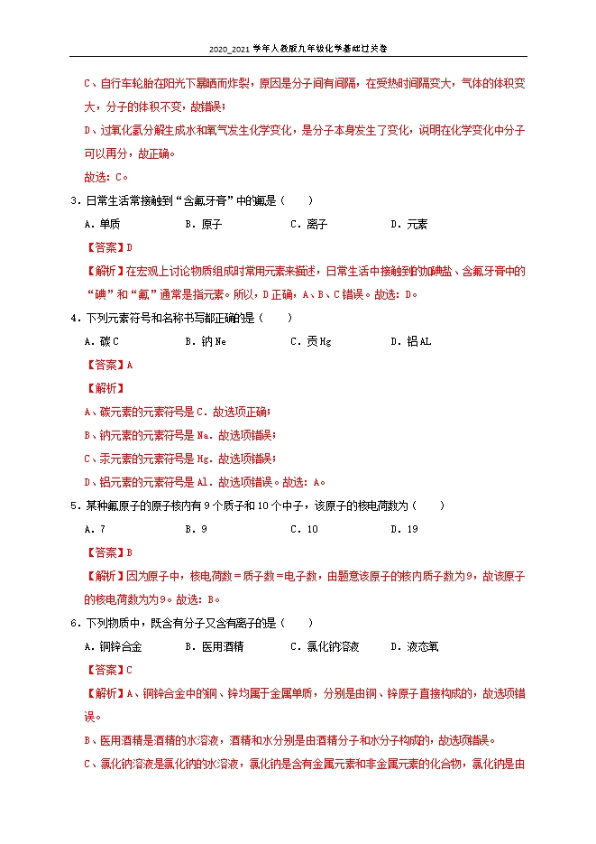 【内容简介】一、选择题:本题共20个小题,每小题2分,共40分。在每小题给出的四个选项中,只有一项是符合题目要求的。1.地壳中含量最多的金属元素是( )A.氧B.硅C.铝D.铁【答案】C【解析】地壳含量较多的元素按含量从高到低的排序为:氧、硅、铝、铁、钙,在金属元素中含量最多的是铝。故选:C。2.化学是在原子、分子的水平上对物质进行研究的基础自然学科。请你运用分子的性质判断,以下事实的解释错误的是( )A.新装修的房子中有异味﹣﹣分子在不断运动B.用扫描隧道显微镜观测到原子和分子﹣﹣分子的体积很小C.自行车轮胎在阳光下暴晒而炸裂﹣﹣分子受热,体积变大D.过氧化氢分解生成水和氧气﹣﹣分子可以再分【答案】C【解析】A、新装修的房间中有异味是因为分子不断运动,装饰材料中的分子运动到空气中。故正确;B、用扫描隧道显微镜观测到原子和分子是因为分子的体积很小,故正确;C、自行车轮胎在阳光下暴晒而炸裂,原因是分子间有间隔,在受热时间隔变大,气体的体积变大,分子的体积不变,故错误;D、过氧化氢分解生成水和氧气发生化学变化,是分子本身发生了变化,说明在化学变化中分子可以再分,故正确。故选:C。3.日常生活常接触到“含氟牙膏”中的氟是( )A.单质B.原子C.离子D.元素【答案】D【解析】在宏观上讨论物质组成时常用元素来描述,日常生活中接触到的加碘盐、含氟牙膏中的“碘”和“氟”通常是指元素。所以,D正确,A、B、C错误。故选:D。......