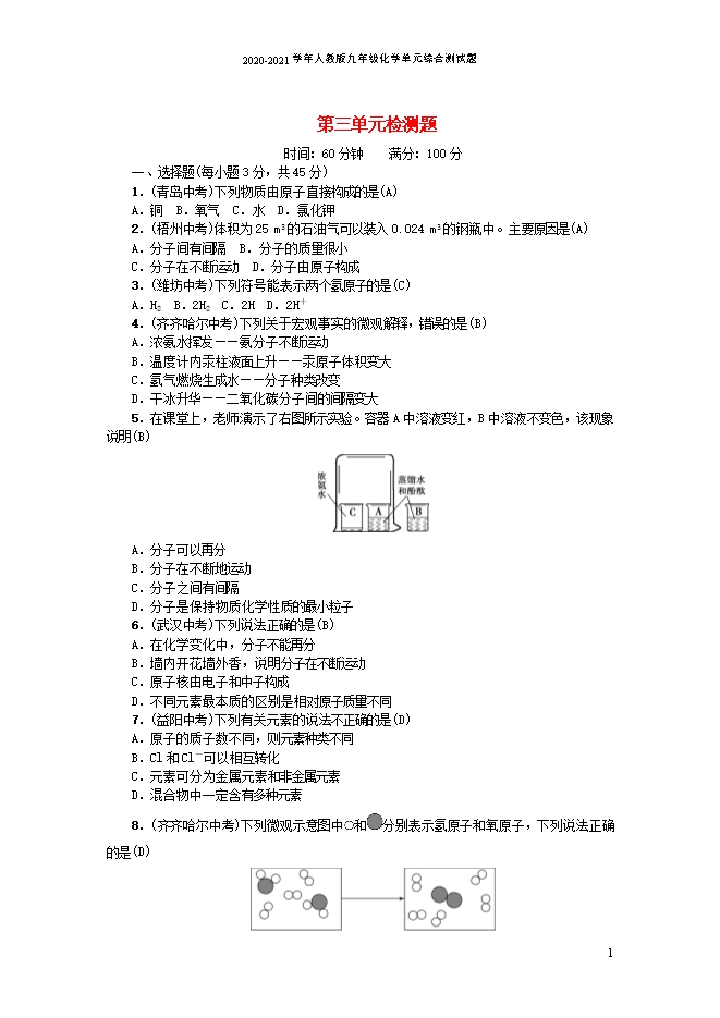 【内容简介】一、选择题(每小题3分,共45分)1.(青岛中考)下列物质由原子直接构成的是(A)A.铜 B.氧气 C.水 D.氯化钾2.(梧州中考)体积为25 m3的石油气可以装入0.024 m3的钢瓶中。主要原因是(A)A.分子间有间隔 B.分子的质量很小 C.分子在不断运动 D.分子由原子构成3.(潍坊中考)下列符号能表示两个氢原子的是(C)A.H2 B.2H2 C.2H D.2H+4.(齐齐哈尔中考)下列关于宏观事实的微观解释,错误的是(B)A.浓氨水挥发——氨分子不断运动B.温度计内汞柱液面上升——汞原子体积变大C.氢气燃烧生成水——分子种类改变D.干冰升华——二氧化碳分子间的间隔变大5.在课堂上,老师演示了右图所示实验。容器A中溶液变红,B中溶液不变色,该现象说明(B) A.分子可以再分B.分子在不断地运动C.分子之间有间隔D.分子是保持物质化学性质的最小粒子6.(武汉中考)下列说法正确的是(B)A.在化学变化中,分子不能再分B.墙内开花墙外香,说明分子在不断运动C.原子核由电子和中子构成D.不同元素最本质的区别是相对原子质量不同7.(益阳中考)下列有关元素的说法不正确的是(D)A.原子的质子数不同,则元素种类不同B.Cl和Cl-可以相互转化C.元素可分为金属元素和非金属元素D.混合物中一定含有多种元素......