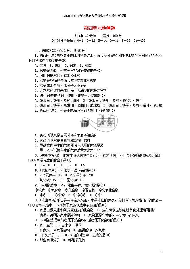 2020-2021学年人教版九年级化学《第四单元 自然界的水》单元综合测试题(word版含答案)