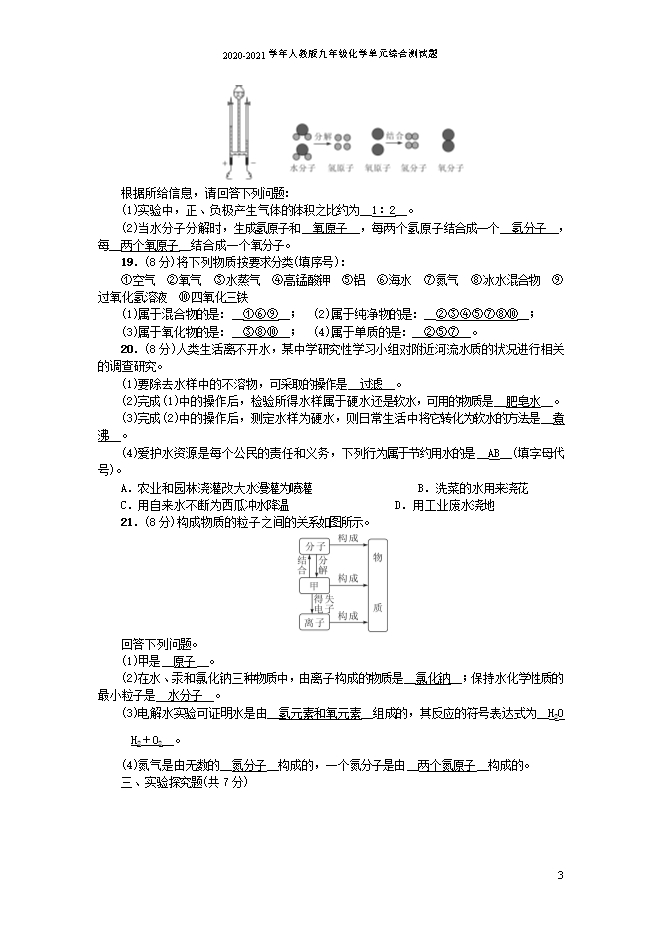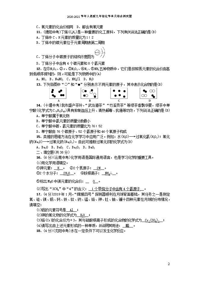 【内容简介】一、选择题(每小题3分,共45分)1.(衡阳中考)自然界中的水都不是纯水,通过多种途径可以使水得到不同程度的净化,下列净化程度最高的是(D)A.沉淀 B.吸附 C.过滤 D.蒸馏2.(烟台改编)下列有关水的叙述错误的是(D)A.可用肥皂水区分软水和硬水B.水的天然循环是通过其三态变化实现的C.水变成水蒸气,水分子大小不变D.天然水经过自来水厂净化后得到的水是纯净物3.进行过滤操作时,使用正确的一组仪器是(D)A.铁架台、铁圈、烧杯、漏斗 B.铁架台、铁圈、烧杯、酒精灯、漏斗C.铁架台、铁圈、蒸发皿、酒精灯、玻璃棒 D.铁架台、铁圈、烧杯、漏斗、玻璃棒4.(锦州中考)下列关于电解水实验的叙述正确的是(C) A.实验说明水是由氢分子和氧原子组成的B.实验说明水是由氢气和氧气组成的C.甲试管内产生的气体能使带火星的木条复燃D.甲、乙两试管产生的气体质量之比为1∶25.(恩施中考)某工地发生多人食物中毒,经化验为误食工业用盐亚硝酸钠(NaNO2)所致。NaNO2中氮元素的化合价是(B)A.+4 B.+3 C.+2 D.+56.(成都中考)下列化学用语正确的是(D)A.2个氢原子:H2 B.2个氮分子:2NC.氧化铁:FeO D.氯化钾:KCl7.下列物质中,不可能由一种元素组成的是(B)①单质 ②氧化物 ③化合物 ④混合物 ⑤含氧化合物A.①④ B.②③⑤ C.②③④⑤ D.②③8.(乐山中考)乐山是一座亲水城市,水是乐山的灵魂,我们应该像珍惜自己的血液一样珍惜每一滴水。下列关于水的说法中不正确的是(C)A.水是由氢元素和氧元素组成的化合物 B.城市污水应该经过净化处理后再排放C.清澈、透明的泉水是纯净物 D.水资源是宝贵的,一定要节约用水9.下列各选项中前者属于混合物,后者属于化合物的是(C)A.水 空气 B.自来水 氧气C.矿泉水 冰水混合物 D.高锰酸钾 双氧水10.下列关于O3、CuO、SO2的说法中,正确的是(D)A.都含有氧分子 B.都是氧化物C.氧元素的化合价相同 D.都含有氧元素11.(德阳中考)丁烯(C4H8)是一种重要的化工原料,下列有关说法正确的是(B)A.丁烯中C、H元素的质量比为1∶2B.丁烯中的碳元素位于元素周期表第二周期C.丁烯分子中碳原子的结构示意图为 D.丁烯分子中含有4个碳元素和8个氢元素12.在①N2O5、②x、③N2O3、④N2、⑤NH3五种物质中,它们是按照氮元素的化合价由高到低顺序排列的,则x可能是下列物质中的(A)A.NO2 B.NaNO2 C.NH4Cl D.N2O13.下列各图中“ ”和“ ”分别表示不同元素的原子,其中表示化合物的是(B) 14.(十堰中考)我市盛产茶叶,“武当道茶”“竹溪贡茶”等绿茶香飘华夏,绿茶中单宁酸(化学式为C76H52O46)具有抑制血压上升、清热解毒、抗癌等功效,下列说法正确的是(B)A.单宁酸属于氧化物B.单宁酸中氢元素的质量分数最小C.单宁酸中碳、氢元素的质量比为76∶52D.单宁酸由76个碳原子、52个氢原子和46个氧原子构成15.类推的思维方法在化学学习中应用广泛。例如:水(H2O)―→过氧化氢(H2O2);氧化钠(Na2O)―→过氧化钠(Na2O2)。由此可推断过氧化钡的化学式为(B)A.Ba2O B.BaO2 C.Ba2O2 D.BaO3二、填空题(共38分)16.(6分)(云南中考)化学用语是国际通用语言,也是学习化学的重要工具。(1)用化学用语填空。①钾元素:__K__。 ②2个氮原子:__2N__。③2个水分子:__2H2O__。 ④铵根离子:__NH4+__。⑤标出MgO中镁元素的化合价:__Mg+2O__。(2)写出“3CH4”中“4”的含义:__1个甲烷分子中含有4个氢原子__。17.(4分)2019年1月,“嫦娥四号”探测器顺利在月球背面着陆,其任务之一是测定氧、硅、镁、铝、钙、铁、钛、钠、锰、铬、钾、钍、铀、镧十四种元素在月球的分布情况,请填空:(1)铝的元素符号是__Al__;(2)钾的氧化物的化学式为__K2O__;(3)铬(Cr)的化合价为+3,其与硫酸根离子形成的化合物的化学式为__Cr2(SO4)3__;(4)请写出由上述元素形成的一种单质,并说明其用途:__略__。18.(4分)(沈阳中考)水在一定条件下可以发生化学反应。......