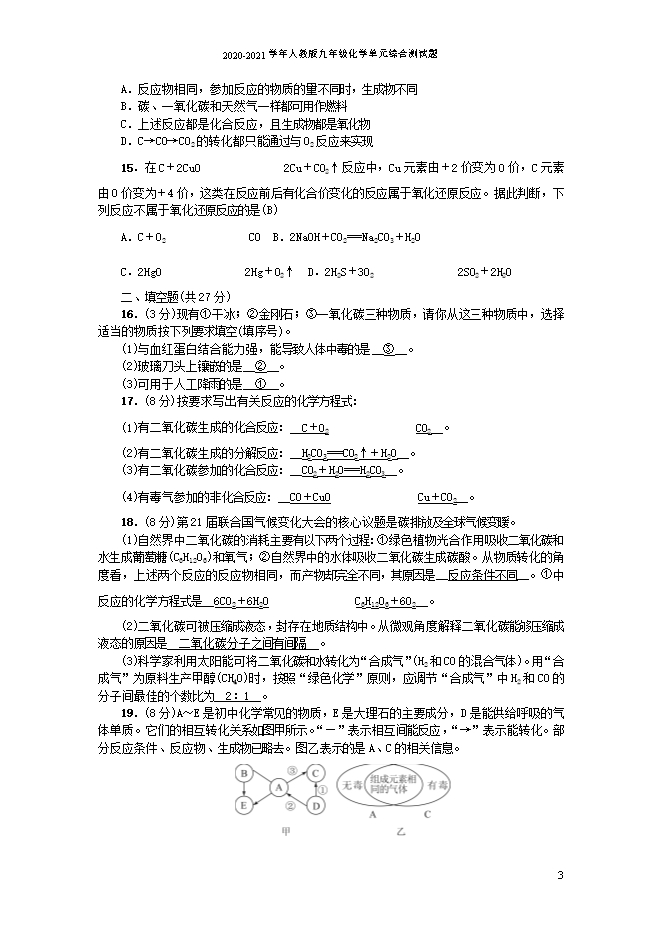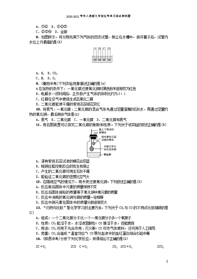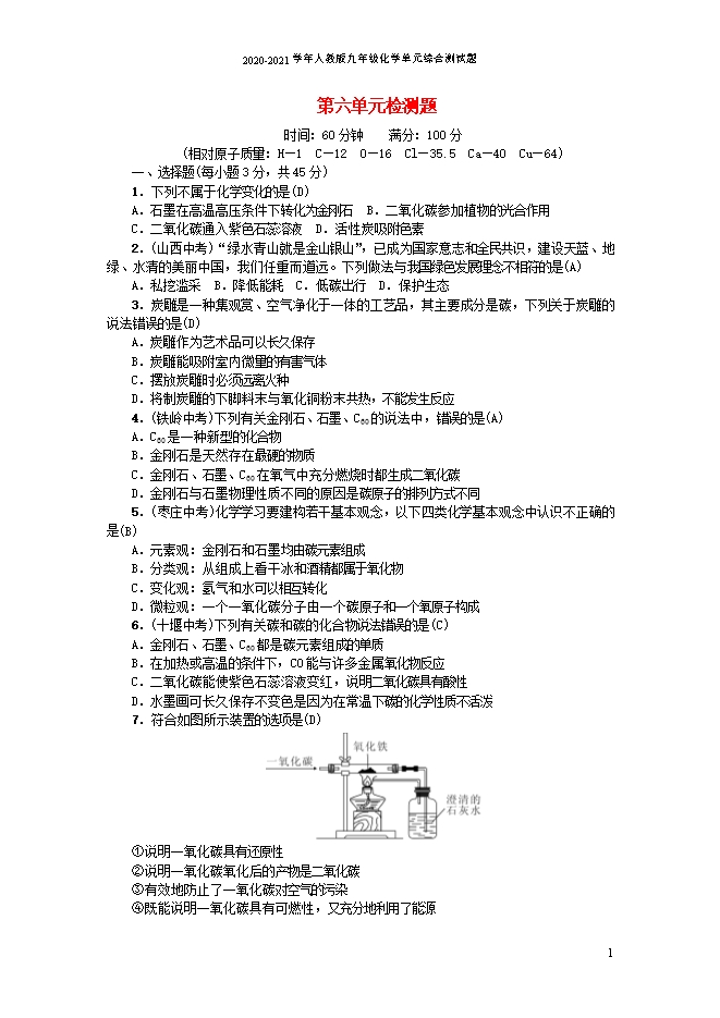 2020-2021学年人教版九年级化学《第六单元 碳和碳的氧化物》单元综合测试题(word版含答案)