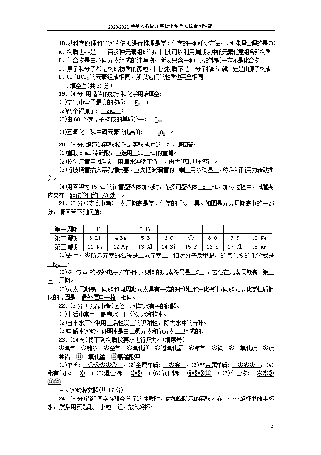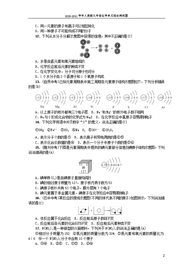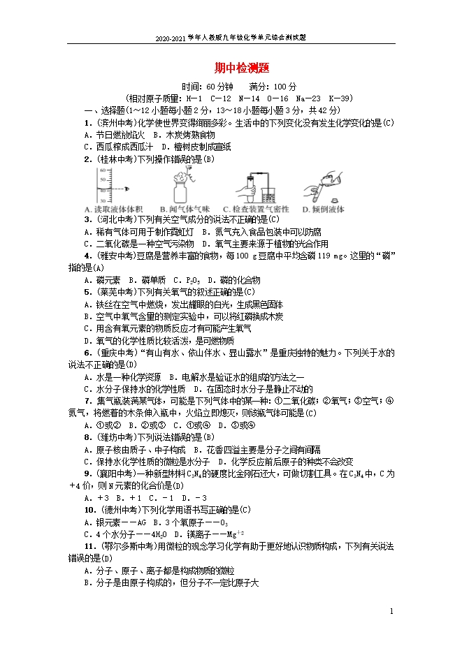 【内容简介】一、选择题(1~12小题每小题2分,13~18小题每小题3分,共42分)1.(滨州中考)化学使世界变得绚丽多彩。生活中的下列变化没有发生化学变化的是(C)A.节日燃放焰火 B.木炭烤熟食物C.西瓜榨成西瓜汁 D.檀树皮制成宣纸2.(桂林中考)下列操作错误的是(B) 3.(河北中考)下列有关空气成分的说法不正确的是(C)A.稀有气体可用于制作霓虹灯 B.氮气充入食品包装中可以防腐C.二氧化碳是一种空气污染物 D.氧气主要来源于植物的光合作用4.(雅安中考)豆腐是营养丰富的食物,每100 g豆腐中平均含磷119 mg。这里的“磷”指的是(A)A.磷元素 B.磷单质 C.P2O5 D.磷的化合物5.(莱芜中考)下列有关氧气的叙述正确的是(C)A.铁丝在空气中燃烧,发出耀眼的白光,生成黑色固体B.空气中氧气含量的测定实验中,可以将红磷换成木炭C.用含有氧元素的物质反应才有可能产生氧气D.氧气的化学性质比较活泼,是可燃物质6.(重庆中考)“有山有水、依山伴水、显山露水”是重庆独特的魅力。下列关于水的说法不正确的是(D)A.水是一种化学资源 B.电解水是验证水的组成的方法之一C.水分子保持水的化学性质 D.在固态时水分子是静止不动的7.集气瓶装满某气体,可能是下列气体中的某一种:①二氧化碳;②氧气;③空气;④氮气,将燃着的木条伸入瓶中,火焰立即熄灭,则该瓶气体可能是(C)A.①或② B.②或③ C.①或④ D.③或④8.(潍坊中考)下列说法错误的是(B)A.原子核由质子、中子构成 B.花香四溢主要是分子之间有间隔C.保持水化学性质的微粒是水分子 D.化学反应前后原子的种类不会改变9.(襄阳中考)一种新型材料C3N4的硬度比金刚石还大,可做切割工具。在C3N4中,C为+4价,则N元素的化合价是(D)A.+3 B.+1 C.-1 D.-310.(德州中考)下列化学用语书写正确的是(C)A.银元素——AG B.3个氧原子——O3C.4个水分子——4H2O D.镁离子——Mg+211.(鄂尔多斯中考)用微粒的观念学习化学有助于更好地认识物质构成,下列有关说法错误的是(D)A.分子、原子、离子都是构成物质的微粒B.分子是由原子构成的,但分子不一定比原子大......