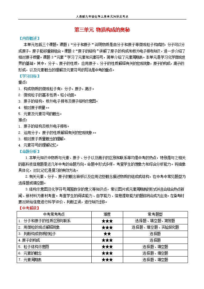 【内容简介】【内容概述】本单元包括三个课题。课题1“分子和原子”说明物质是由分子和原子等微观粒子构成的,分子可以分成原子,原子能够重新组合。课题2“原子的结构”讲解了原子的构成和核外电子排布知识,进一步介绍了相对原子质量。课题3“元素”学习了元素和元素符号,简单介绍了元素周期表。本单元是学习化学微观世界的基础。其中,分子、原子的性质,应用原子、分子的性质解释有关的宏观现象,原子的构成,离子的形成,以及元素概念的理解及元素符号的写法是中考的重点。【学习目标】重点:1. 构成物质的微观粒子有:分子,原子,离子。2. 微观粒子的基本性质。轻小动距。3. 原子的结构,核外电子排布及原子结构示意图。4. 相对原子质量。。5. 元素及元素符号的概念。难点:1. 原子的结构及核外电子排布。2. 运用分子,原子的性质解释有关的宏观现象。。3. 相对原子质量概念的理解。4. 元素符号的理解记忆。【命题分析】1.本单元知识中物质与元素、原子、分子以及离子的区别和联系等均是中考的热点,特别是与之相关的高科技信息题是近几年中考的命题方向。命题中形式多样,考查学生的想象力和综合分析能力。将抽象具体化,对比记忆是复习的有效方法。2.有关元素、分子、原子的概念辨析以及应用这些概念描述物质的组成或结构,在中考中常见题型为选择题或填空题。3.结构示意图及化学符号周围数字的意义等知识点,常以图片或元素周期表的形式并且会结合热点新闻、新材料为素材考查。考查学生的阅读能力、自学能力、信息提取能力的题目将会成为主流。在备考时要对所给信息进行科学评价、判断正误,进行知识迁移。【中考解读】......