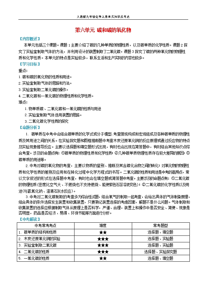 【内容简介】【内容概述】本单元包括三个课题。课题1主要介绍了碳的几种单质的物理性质,以及碳单质的化学性质。课题2探究了实验室制取气体的方法,并利用设计的装置制取了二氧化碳。课题3探究了碳的两种氧化物的物理性质和化学性质。本单元的特点是实验较多,联系生活和生产实际的内容也较多。【学习目标】重点:1.碳和碳的氧化物的性质和用途。2.实验室制取气体的思路和方法。3.实验室制取二氧化碳的操作。4.二氧化碳和一氧化碳的物理性质和化学性质。难点:1.物单质碳、二氧化碳和一氧化碳的性质与用途2.实验室制取气体选用装置的思路。3.二氧化碳化学性质的探究【命题分析】1. 碳单质在中考中会结合碳单质的化学式或分子模型,考查微观构成和宏观组成及各种碳单质的物理性质及其用途之间的关系。在实验探究题和图框推断题中考查木炭还原氧化铜的反应原理或通过反应物的特点及实验现象推导反应。主要以选择题和填空题形式出现,有时也会出现在简答题中,有时结合其他知识点综合考查。涉及的命题点有:①碳单质的物理性质和化学性质;②几种碳单质物理性质存在较大差异的原因;③碳单质的用途等。2.中考对碳的氧化物的考查,主要以物质的鉴别、推断及其含碳化合物之间的转化;对氧化物的物理性质和化学性质的差别及应用和在转化过程中化学方程式的书写。二氧化碳的性质和用途是中考的高频点,常以文字叙述的形式在选择题中考查,有时也会在填空题或简答题中考查。主要涉及的命题点有:①二氧化碳的物理性质(密度比空气大、不燃烧也不支持燃烧、能使紫色石蕊溶液变色);②二氧化碳的化学性质以及用途(与氢氧化钠、澄清石灰水反应)。3.中考对二氧化碳制取的考查多为综合性试题,结合氧气的制取一起考查,会给出具体的气体制备原理,结合具体的条件选择发生装置和收集装置,只要熟记装置选择的考虑因素,解题不是什么问题。气体制取和收集装置的选择应根据制取气体从原理上是否科学,严谨、合理,装置上和操作中是否安全、简便、现象是否明显,药品是否经济、易得、环保节能等方面进行分析。【中考解读】......