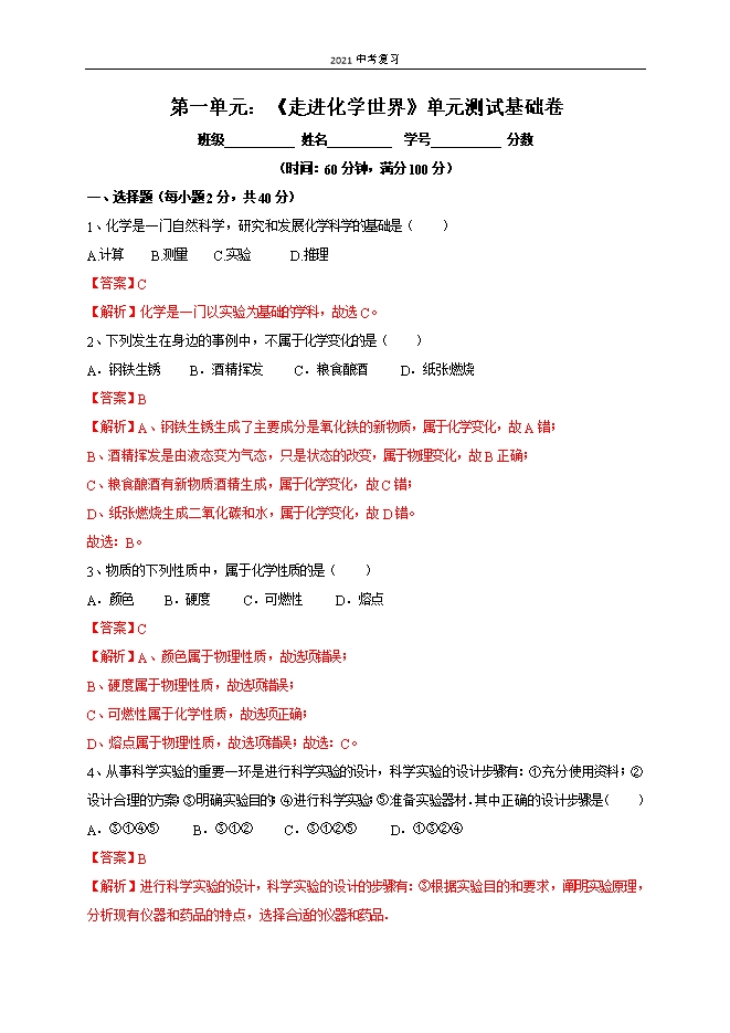 2021中考复习:人教版初中化学《第1单元 走进化学世界》单元测试基础卷(解析版)