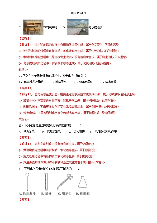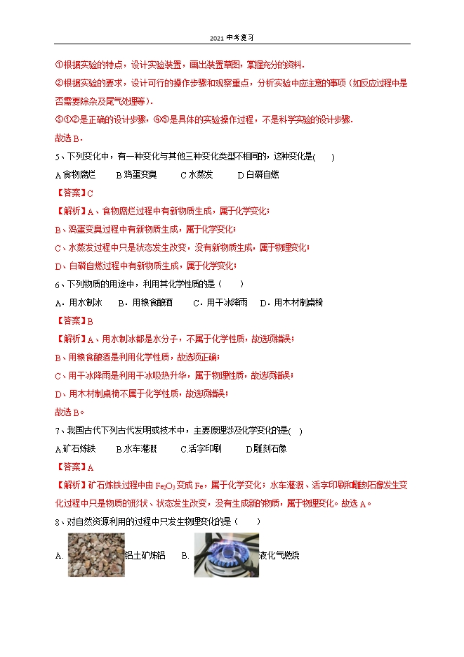 【内容简介】一、选择题(每小题2分,共40分)1、化学是一门自然科学,研究和发展化学科学的基础是( )A.计算 B.测量 C.实验 D.推理【答案】C【解析】化学是一门以实验为基础的学科,故选C。2、下列发生在身边的事例中,不属于化学变化的是( )A.钢铁生锈 B.酒精挥发 C.粮食酿酒 D.纸张燃烧【答案】B【解析】A、钢铁生锈生成了主要成分是氧化铁的新物质,属于化学变化,故A错;B、酒精挥发是由液态变为气态,只是状态的改变,属于物理变化,故B正确;C、粮食酿酒有新物质酒精生成,属于化学变化,故C错;D、纸张燃烧生成二氧化碳和水,属于化学变化,故D错。故选:B。3、物质的下列性质中,属于化学性质的是( )A.颜色 B.硬度 C.可燃性 D.熔点【答案】C【解析】A、颜色属于物理性质,故选项错误;B、硬度属于物理性质,故选项错误;C、可燃性属于化学性质,故选项正确;D、熔点属于物理性质,故选项错误;故选:C。......