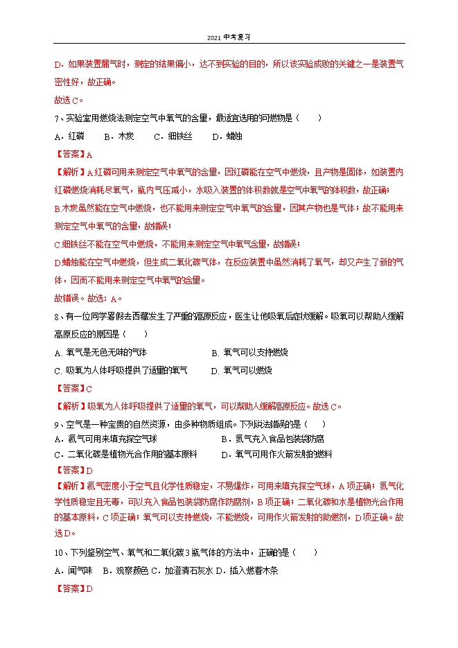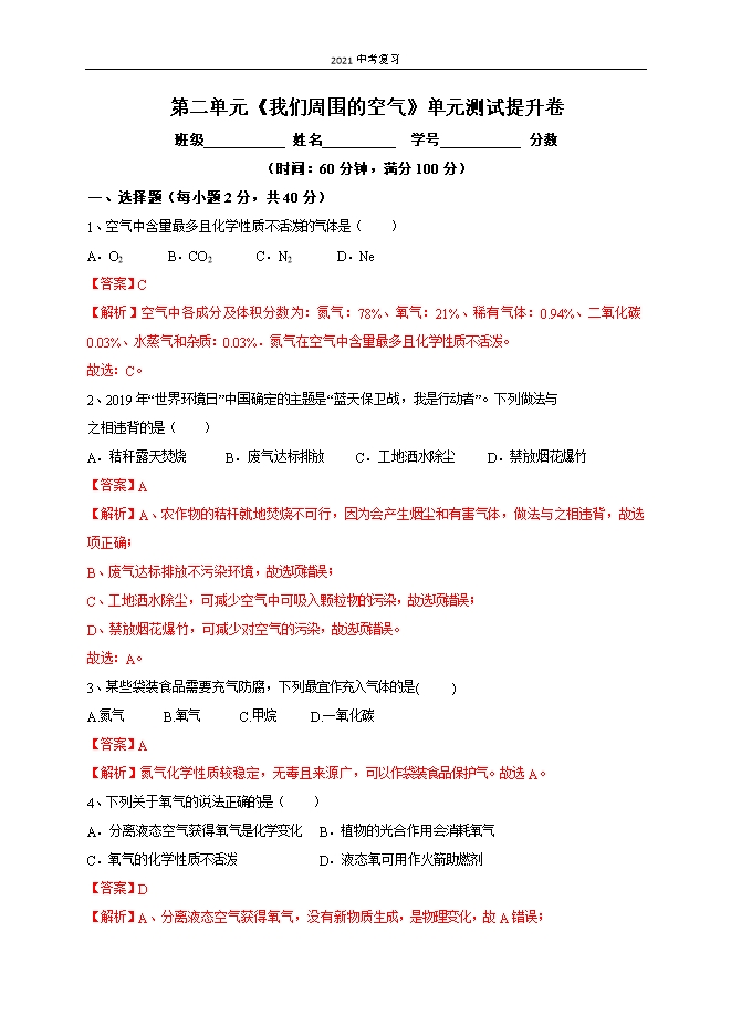 【内容简介】一、选择题(每小题2分,共40分)1、空气中含量最多且化学性质不活泼的气体是( )A.O2 B.CO2 C.N2 D.Ne【答案】C【解析】空气中各成分及体积分数为:氮气:78%、氧气:21%、稀有气体:0.94%、二氧化碳0.03%、水蒸气和杂质:0.03%.氮气在空气中含量最多且化学性质不活泼。故选:C。2、2019年“世界环境日”中国确定的主题是“蓝天保卫战,我是行动者”。下列做法与之相违背的是( )A.秸秆露天焚烧 B.废气达标排放 C.工地洒水除尘 D.禁放烟花爆竹【答案】A【解析】A、农作物的秸杆就地焚烧不可行,因为会产生烟尘和有害气体,做法与之相违背,故选项正确;B、废气达标排放不污染环境,故选项错误;C、工地洒水除尘,可减少空气中可吸入颗粒物的污染,故选项错误;D、禁放烟花爆竹,可减少对空气的污染,故选项错误。故选:A。3、某些袋装食品需要充气防腐,下列最宜作充入气体的是( )A.氮气 B.氧气 C.甲烷 D.一氧化碳【答案】A【解析】氮气化学性质较稳定,无毒且来源广,可以作袋装食品保护气。........