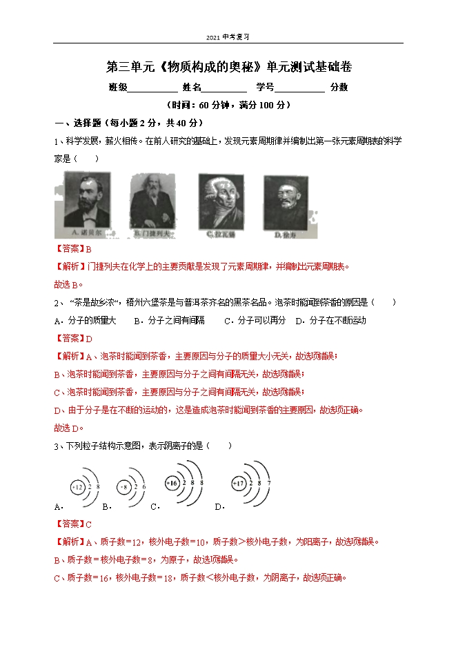 【内容简介】第三单元《物质构成的奥秘》单元测试基础卷班级 姓名 学号 分数(时间:60分钟,满分100分)一、选择题(每小题2分,共40分)1、科学发展,薪火相传。在前人研究的基础上,发现元素周期律并编制出第一张元素周期表的科学家是( ) 【答案】B【解析】门捷列夫在化学上的主要贡献是发现了元素周期律,并编制出元素周期表。故选B。2、 “茶是故乡浓“,梧州六堡茶是与普洱茶齐名的黑茶名品。泡茶时能闻到茶香的原因是( )A.分子的质量大 B.分子之间有间隔 C.分子可以再分 D.分子在不断运动【答案】D【解析】A、泡茶时能闻到茶香,主要原因与分子的质量大小无关,故选项错误;B、泡茶时能闻到茶香,主要原因与分子之间有间隔无关,故选项错误;C、泡茶时能闻到茶香,主要原因与分子之间有间隔无关,故选项错误;D、由于分子是在不断的运动的,这是造成泡茶时能闻到茶香的主要原因,故选项正确。故选D。3、下列粒子结构示意图,表示阴离子的是( )........