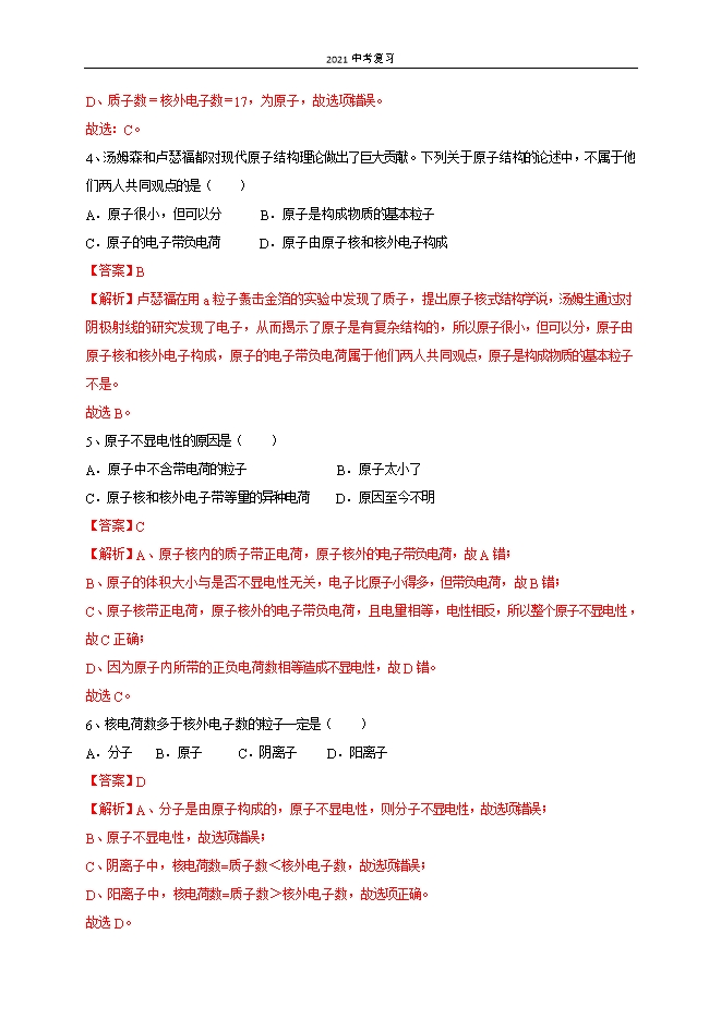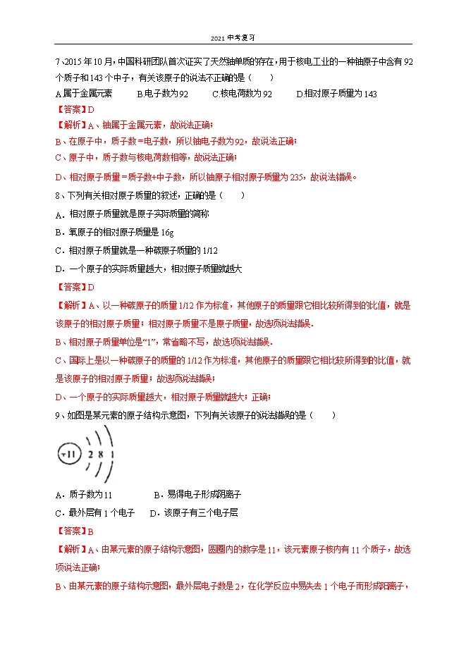 2021中考复习:人教版初中化学《第3单元 物质构成的奥妙》单元测试基础卷(解析版)