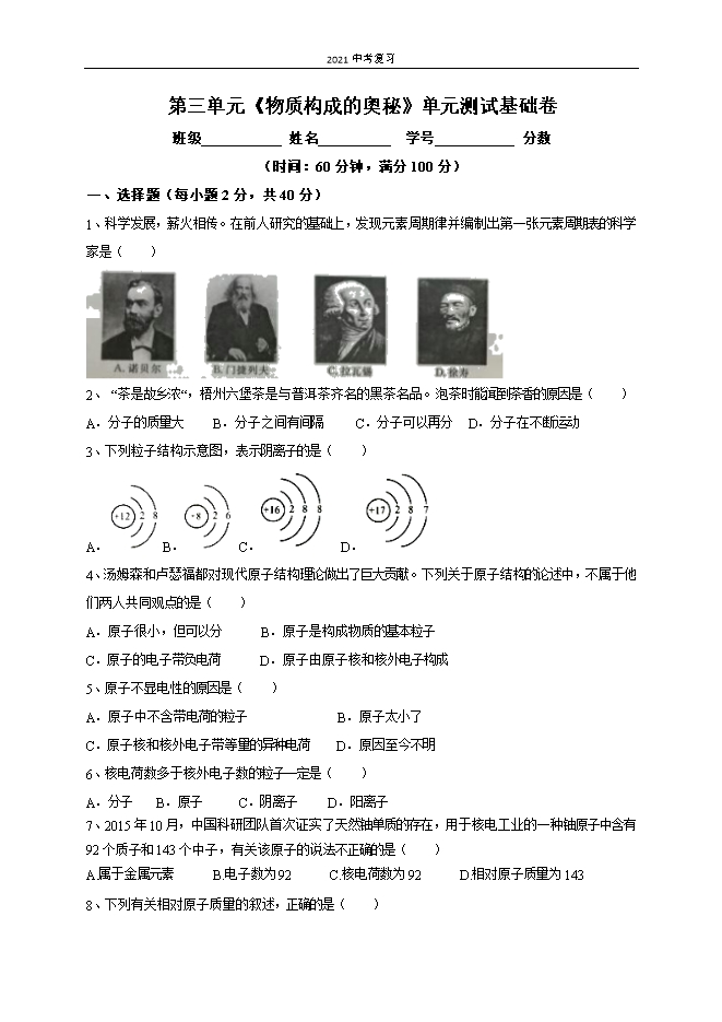 【内容简介】第三单元《物质构成的奥秘》单元测试基础卷班级 姓名 学号 分数(时间:60分钟,满分100分)一、选择题(每小题2分,共40分)1、科学发展,薪火相传。在前人研究的基础上,发现元素周期律并编制出第一张元素周期表的科学家是( ) 2、 “茶是故乡浓“,梧州六堡茶是与普洱茶齐名的黑茶名品。泡茶时能闻到茶香的原因是( )A.分子的质量大 B.分子之间有间隔 C.分子可以再分 D.分子在不断运动3、下列粒子结构示意图,表示阴离子的是( )A. B. C. D. 4、汤姆森和卢瑟福都对现代原子结构理论做出了巨大贡献。下列关于原子结构的论述中,不属于他们两人共同观点的是( )A.原子很小,但可以分 B.原子是构成物质的基本粒子C.原子的电子带负电荷 D.原子由原子核和核外电子构成5、原子不显电性的原因是( )A.原子中不含带电荷的粒子 B.原子太小了C.原子核和核外电子带等量的异种电荷 D.原因至今不明6、核电荷数多于核外电子数的粒子一定是( )A.分子 B.原子 C.阴离子 D.阳离子7、2015年10月,中国科研团队首次证实了天然铀单质的存在,用于核电工........