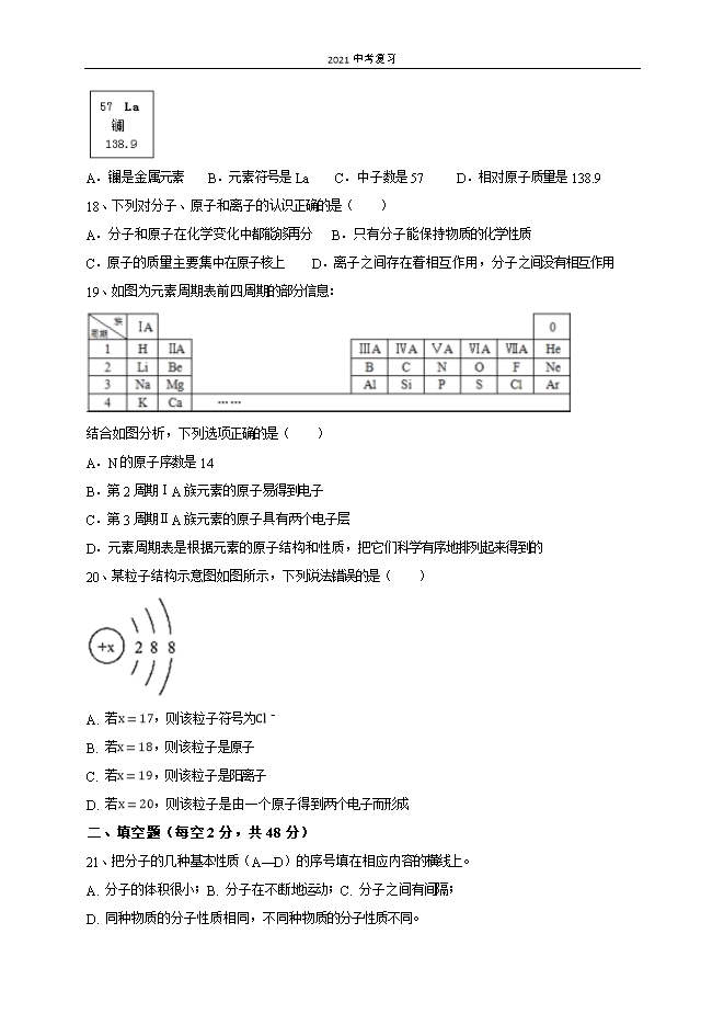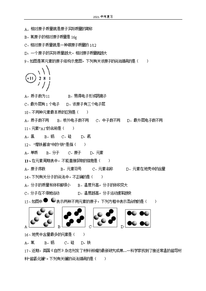 2021中考复习:人教版初中化学《第3单元 物质构成的奥妙》单元测试基础卷(原卷版)
