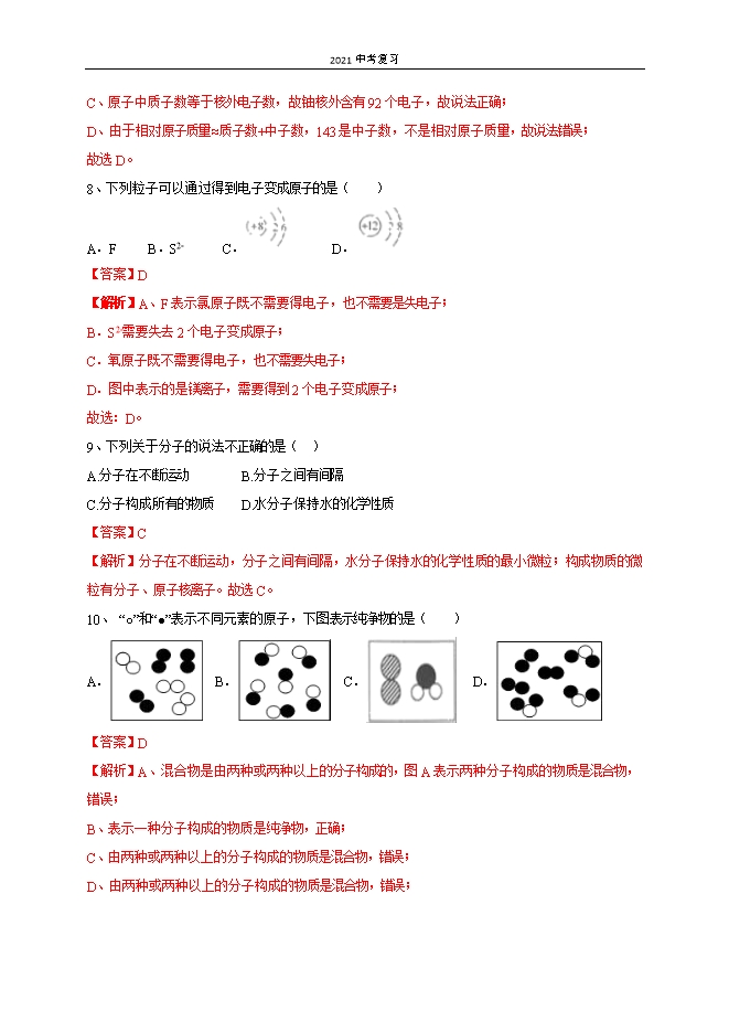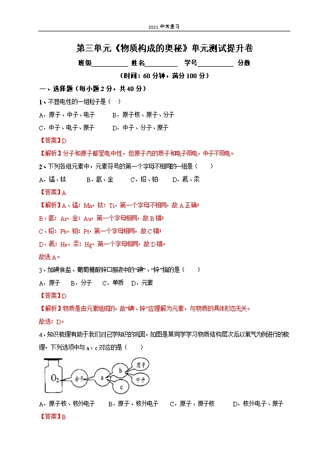 【内容简介】第三单元《物质构成的奥秘》单元测试提升卷班级 姓名 学号 分数(时间:60分钟,满分100分)一、选择题(每小题2分,共40分)1、不显电性的一组粒子是( )A.原子、中子、电子 B.原子核、原子、分子C.中子、电子、原子 D.中子、分子、原子【答案】D【解析】分子和原子都呈电中性,但原子内的质子和电子带电,中子不带电。2、下列各组元素中,元素符号的第一个字母不相同的一组是( )A.锰、钛 B.氩、金 C.铅、铂 D.氦、汞【答案】A【解析】A、锰:Mn,钛:Ti,第一个字母不相同,故A正确;B、氩:Ar,金:Au,第一个字母相同,故B错;C、铅:Pb,铂:Pt,第一个字母相同,故C错;D、氦:He,汞:Hg,第一个字母相同,故D错。故选A。3、加碘食盐、葡萄糖酸锌口服液中的“碘”、“锌”指的是( )A.原子 B.分子 C.单质 D.元素【答案】D【解析】物质是由元素组成的,故“碘、锌”应理解为元素,与物质的具体形态无关。故选:D。4、知识梳理有助于我们对已学知识的巩固,如图是某同学学习物质结构层次后........