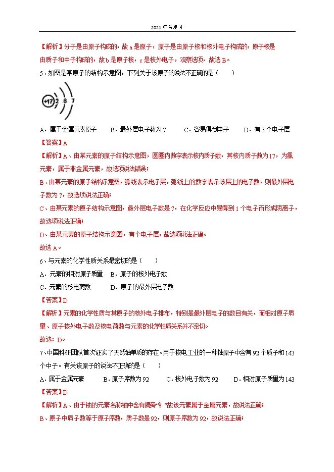 2021中考复习:人教版初中化学《第3单元 物质构成的奥妙》单元测试提升卷(解析版)
