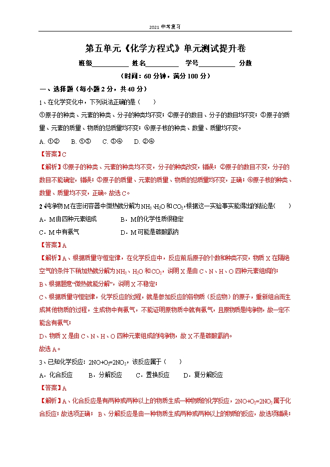 【内容简介】第五单元《化学方程式》单元测试提升卷班级 姓名 学号 分数(时间:60分钟,满分100分)一、选择题(每小题2分,共40分)1、在化学变化中,下列说法正确的是( )①原子的种类、元素的种类、分子的种类均不变;②原子的数目、分子的数目均不变;③原子的质量、元素的质量、物质的总质量均不变;④原子核的种类、数量、质量均不变。A. ①② B. ①③ C. ③④ D. ②④【答案】C【解析】①原子的种类、元素的种类均不变,分子的种类改变,错误;②原子的数目不变,分子的数目不能确定,错误;③原子的质量、元素的质量、物质的总质量均不变,正确;④原子核的种类、数量、质量均不变,正确。故选C。2、纯净物M在密闭容器中微热就分解为NH3、H2O和CO2,根据这一实验事实能得出的结论是( )A.M由四种元素组成 B.M的化学性质很稳定C.M中有氨气 D.M可能是碳酸氢钠【答案】A【解析】A、根据质量守恒定律,在化学反应中,反应前后原子的个数和种类不变,物质X在隔绝空气的条件下稍加热就分解为NH3、H2O和CO2,说明X是由C、N、H、O四种元素组成的;B、根据题意“微热就能分解”,说明X不稳定;C、根据质量守恒定律,化学反应的过程,就是参加反应的各物质(反应物)的原子,重新组合而生成其他物质的过程,生成物中有氨气,不能证明原物质中就有氨气,且原物质是纯......