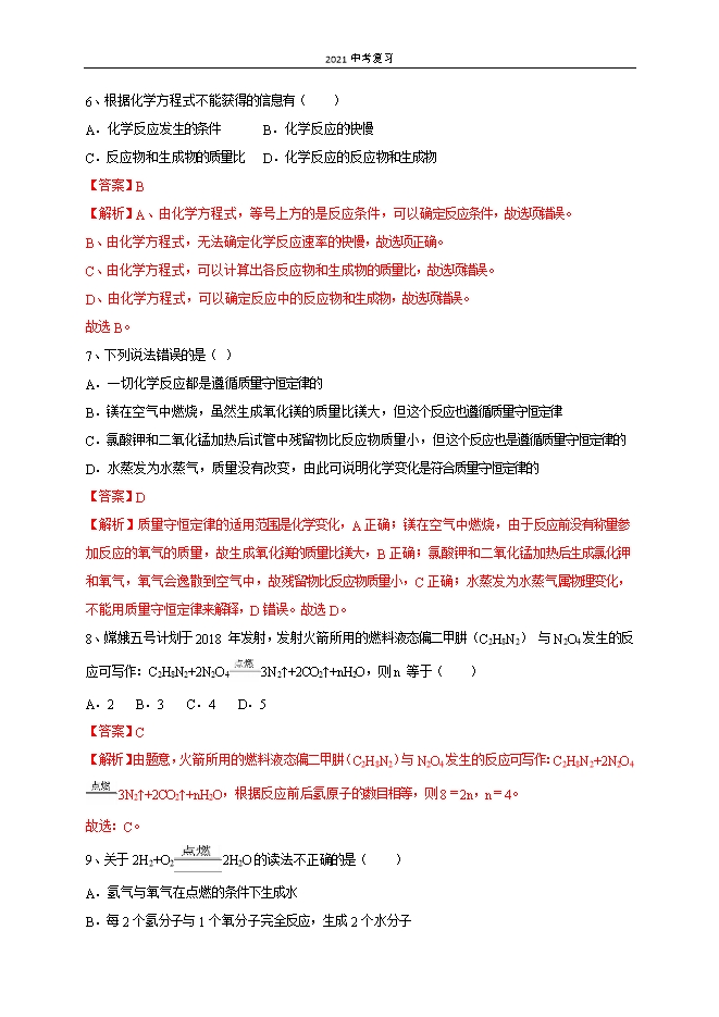 2021中考复习:人教版初中化学《第5单元 化学方程式》单元测试提升卷(解析版)