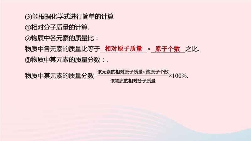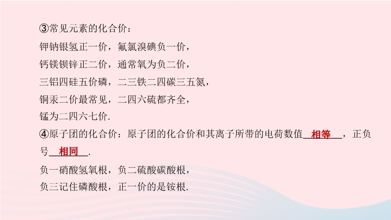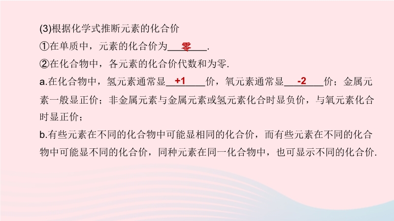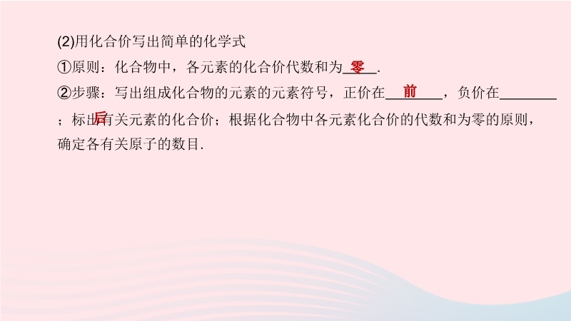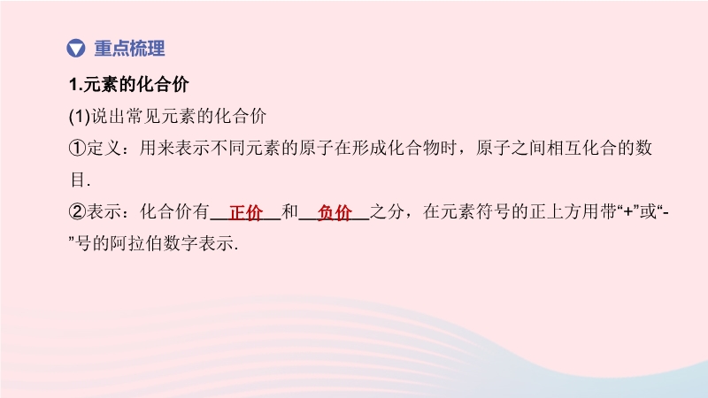 【内容简介】1.元素的化合价(1)说出常见元素的化合价①定义:用来表示不同元素的原子在形成化合物时,原子之间相互化合的数目.②表示:化合价有 和 之分,在元素符号的正上方用带“+”或“-”号的阿拉伯数字表示. (2)用化合价写出简单的化学式①原则:化合物中,各元素的化合价代数和为 . ②步骤:写出组成化合物的元素的元素符号,正价在 ,负价在 ;标出有关元素的化合价;根据化合物中各元素化合价的代数和为零的原则,确定各有关原子的数目. .....