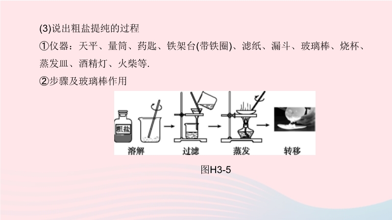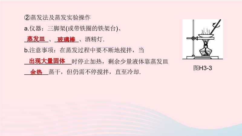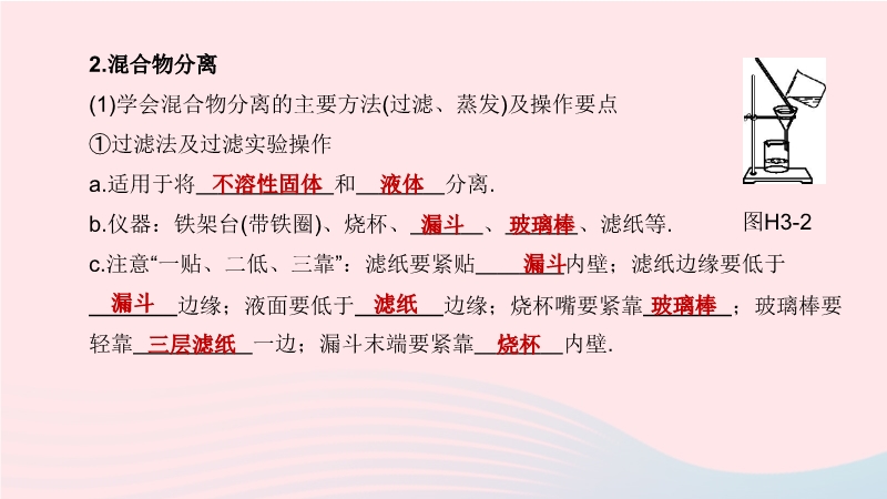 【内容简介】2.混合物分离(1)学会混合物分离的主要方法(过滤、蒸发)及操作要点①过滤法及过滤实验操作a.适用于将 和 分离. b.仪器:铁架台(带铁圈)、烧杯、 、 、滤纸等. c.注意“一贴、二低、三靠”:滤纸要紧贴 内壁;滤纸边缘要低于 边缘;液面要低于 边缘;烧杯嘴要紧靠 ;玻璃棒要轻靠 一边;漏斗末端要紧靠 内壁. ②蒸发法及蒸发实验操作a.仪器:三脚架(或带铁圈的铁架台)、 、 、酒精灯. b.注意事项:在蒸发过程中要不断地搅拌,当 时停止加热,剩余少量液体靠蒸发皿 蒸干,但仍需不停搅拌,直至冷却. .....