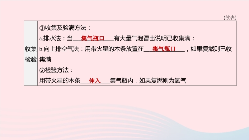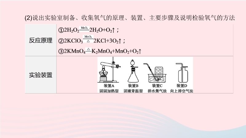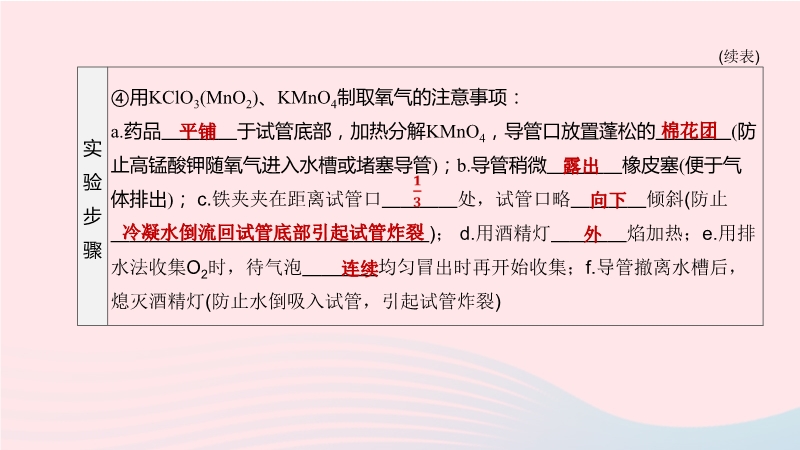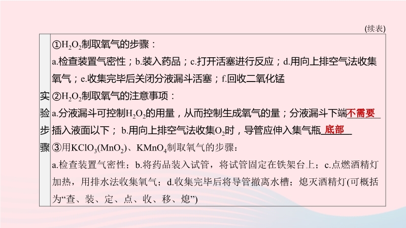 【内容简介】①H2O2制取氧气的步骤:a.检查装置气密性;b.装入药品;c.打开活塞进行反应;d.用向上排空气法收集氧气;e.收集完毕后关闭分液漏斗活塞;f.回收二氧化锰②H2O2制取氧气的注意事项:a.分液漏斗可控制H2O2的用量,从而控制生成氧气的量;分液漏斗下端_______插入液面以下; b.用向上排空气法收集O2时,导管应伸入集气瓶 ③用KClO3(MnO2)、KMnO4制取氧气的步骤:a.检查装置气密性;b.将药品装入试管,将试管固定在铁架台上;c.点燃酒精灯加热,用排水法收集氧气;d.收集完毕后将导管撤离水槽;熄灭酒精灯(可概括为“查、装、定、点、收、移、熄”).....