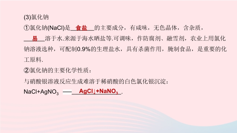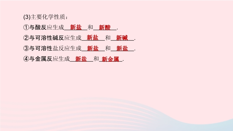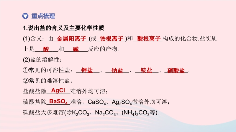 【内容简介】1.说出盐的含义及主要化学性质(1)含义:由 (或 )和 构成的化合物.盐实质上是 和 反应的产物. (2)盐的溶解性:①常见的可溶性盐: 、 、 、 . ②常见的难溶性盐:盐酸盐除 难溶外均可溶; 硫酸盐除 难溶,CaSO4、Ag2SO4微溶外均可溶; 碳酸盐大多难溶(除K2CO3、Na2CO3、(NH4)2CO3等).(3)主要化学性质:①与酸反应生成 和 . ②与可溶性碱反应生成 和 . ③与可溶性盐反应生成 和 . ④与金属反应生成 和 . .....