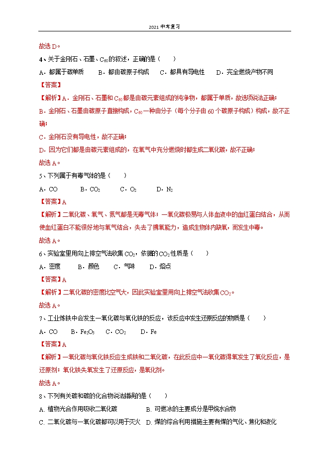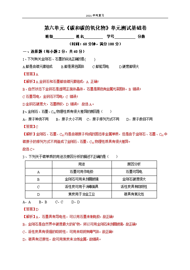 【内容简介】一、选择题(每小题2分,共40分)1、下列有关金刚石、石墨的说法正确的是( )A.都是由碳元素组成 B.都是黑色固体 C.都能导电 D.硬度都很大【答案】A【解析】A.金钢石和石墨都由碳元素组成,A 正确;B、自然状态下金钢石是透明正面体晶体,石墨是黑色有金属光泽固体,B 错误;C石墨导电,金钢石不导电,C 错误;D金钢石硬度大,石墨质软,D 错误; 故选A。2、金刚石、石墨、C60物理性质有很大差异的原因是( )A.原子种类不同 B.原子大小不同 C.原子排列方式不同 D.原子数目不同【答案】C【解析】金刚石、石墨、C60均是由碳原子构成的固态非金属单质,但是由于金刚石、石墨、C60中碳原子的排列方式不同造成了金刚石、石墨、C60物理性质具有很大差异。故选C。3、下列关于碳单质的用途及原因分析的描述不正确的是( )用途原因分析A石墨可用作电极石墨可导电B金刚石可用来刻画玻璃金刚石硬度很大C活性炭可用于消毒面具活性炭具有吸附性D焦炭用于冶金工业碳具有氧化性A.A B.B C.C D.D【答案】D【解析】A.石墨具有导电性,可以用石墨来制电极,故正确;B.金刚石是自然界中硬度最大的矿物,所以可用金刚石来刻画玻璃,故正确;C.活性炭具有很强的吸附性,可用来吸附有毒气体,故正确;D.碳具有还原性,故可用焦炭来冶炼金属,故错误。......