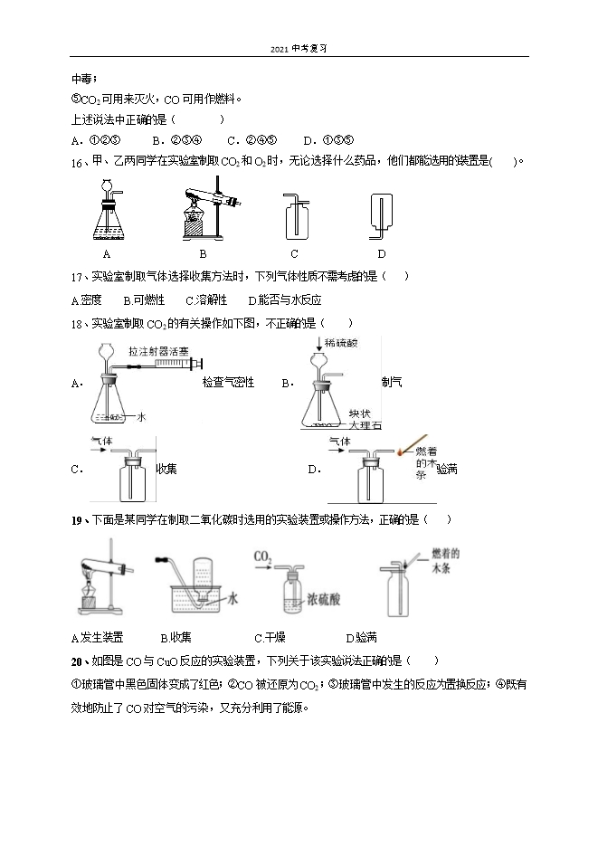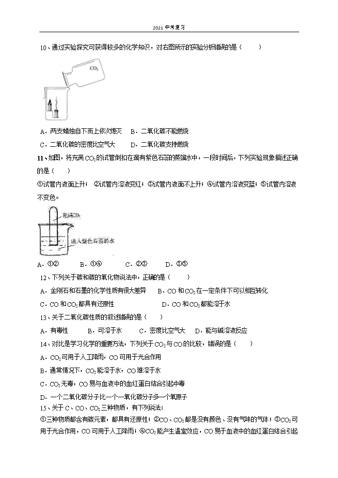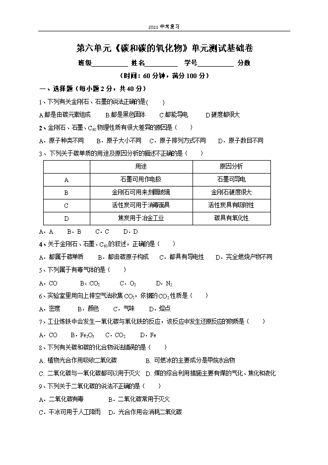 2021中考复习:人教版初中化学《第6单元 碳和碳的氧化物》单元测试基础卷(原卷版)