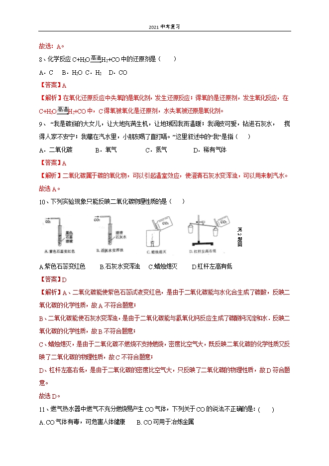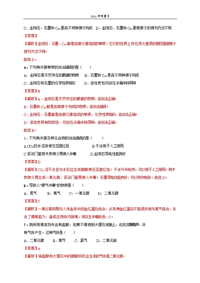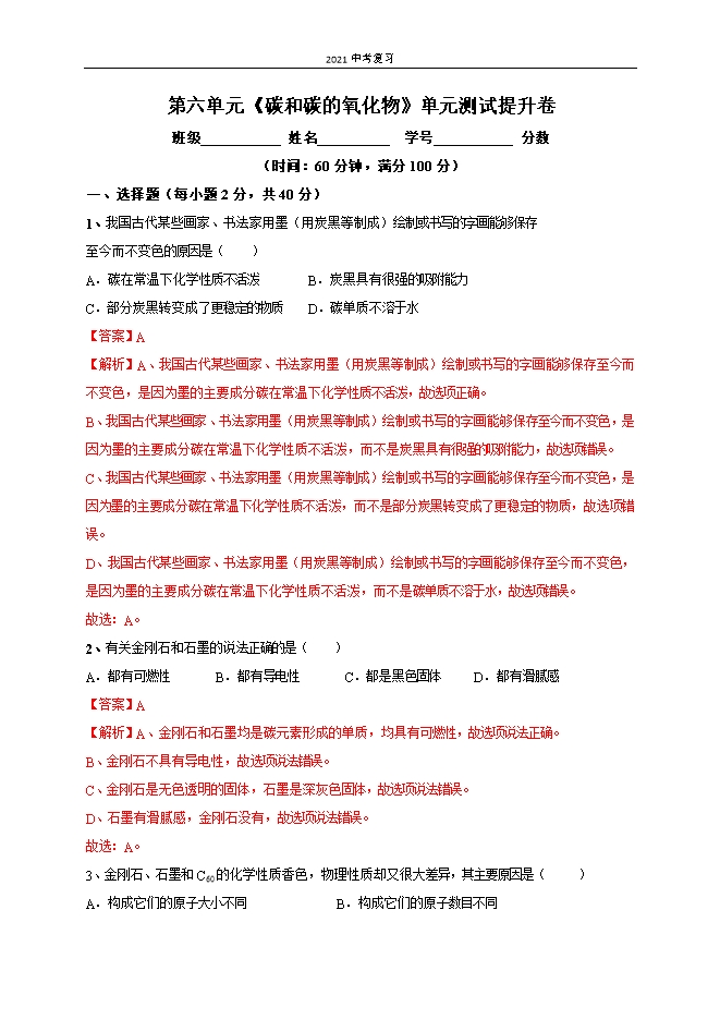 【内容简介】一、选择题(每小题2分,共40分)1、我国古代某些画家、书法家用墨(用炭黑等制成)绘制或书写的字画能够保存至今而不变色的原因是( )A.碳在常温下化学性质不活泼 B.炭黑具有很强的吸附能力 C.部分炭黑转变成了更稳定的物质 D.碳单质不溶于水【答案】A【解析】A、我国古代某些画家、书法家用墨(用炭黑等制成)绘制或书写的字画能够保存至今而不变色,是因为墨的主要成分碳在常温下化学性质不活泼,故选项正确。B、我国古代某些画家、书法家用墨(用炭黑等制成)绘制或书写的字画能够保存至今而不变色,是因为墨的主要成分碳在常温下化学性质不活泼,而不是炭黑具有很强的吸附能力,故选项错误。C、我国古代某些画家、书法家用墨(用炭黑等制成)绘制或书写的字画能够保存至今而不变色,是因为墨的主要成分碳在常温下化学性质不活泼,而不是部分炭黑转变成了更稳定的物质,故选项错误。D、我国古代某些画家、书法家用墨(用炭黑等制成)绘制或书写的字画能够保存至今而不变色,是因为墨的主要成分碳在常温下化学性质不活泼,而不是碳单质不溶于水,故选项错误。故选:A。2、有关金刚石和石墨的说法正确的是( )A.都有可燃性 B.都有导电性 C.都是黑色固体 D.都有滑腻感【答案】A【解析】A、金刚石和石墨均是碳元素形成的单质,均具有可燃性,故选项说法正确。B、金刚石不具有导电性,故选项说法错误。C、金刚石是无色透明的固体,石墨是深灰色固体,故选项说法错误。D、石墨有滑腻感,金刚石没有,故选项说法错误。故选:A。3、金刚石、石墨和C60的化学性质香色,物理性质却又很大差异,其主要原因是( )A.构成它们的原子大小不同 B.构成它们的原子数目不同C.金刚石、石墨和C60里由不同种原子构成 D.金刚石、石墨和C60里碳原子的排列方式......