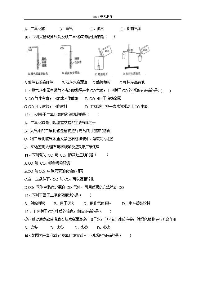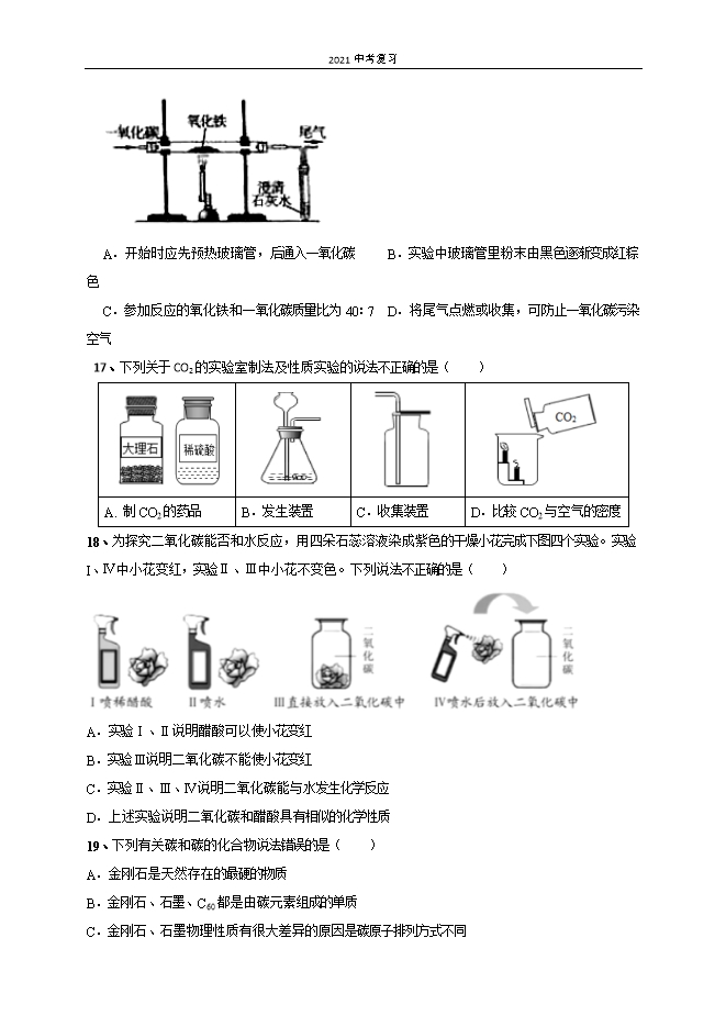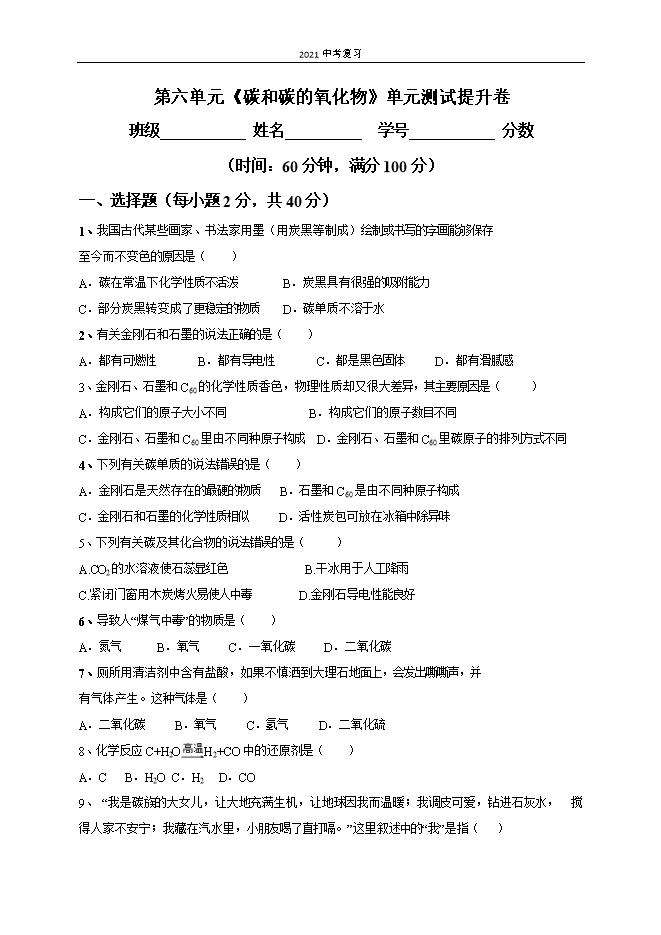 2021中考复习:人教版初中化学《第6单元 碳和碳的氧化物》单元测试提升卷(原卷版)