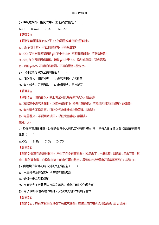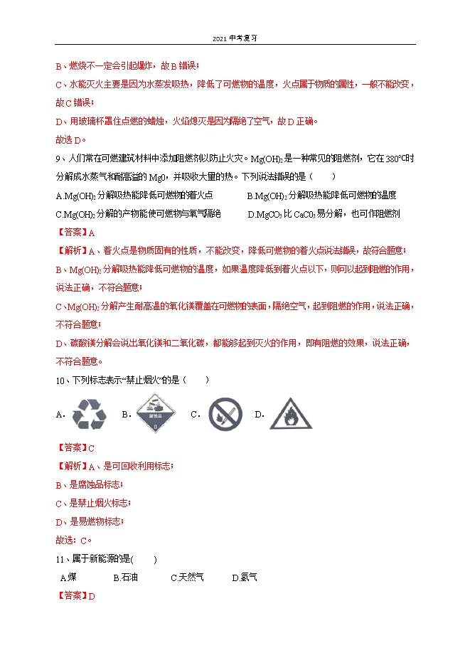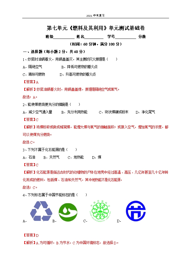 【内容简介】一、选择题(每小题2分,共40分)1、炒菜时油锅着火,用锅盖盖灭,其主要的灭火原理是( )A.隔绝空气 B.降低可燃物的着火点C.清除可燃物 D.升高可燃物的着火点【答案】A【解析】炒菜油锅着火时,用锅盖盖熄,原理是隔绝空气或氧气。故选:A。2、能使煤燃烧更充分的措施是( )A.减少空气通入量 B.充分利用热能 C.块状煤碾成粉末 D.净化尾气【答案】C【解析】将煤粉碎或做成蜂窝煤,能增大煤与氧气的接触面积;或鼓入空气,增加氧气的浓度,都可以使煤充分燃烧。故选C。3、下列不属于化石能源的是( )A.石油 B.天然气 C.地热能 D.煤【答案】C【解析】化石能源是指远古时代的动植物的尸体在地壳中经过高温、高压、几亿年甚至几十亿年转化而成的燃料,包括煤、石油和天然气,其中地热能不是化石能源,故选:C。4、下列标志属于中国节能标志的是( )A. B. C. D. 【答案】D【解析】A为可循环,B为节水,C为中国环境标志,故选择D。......