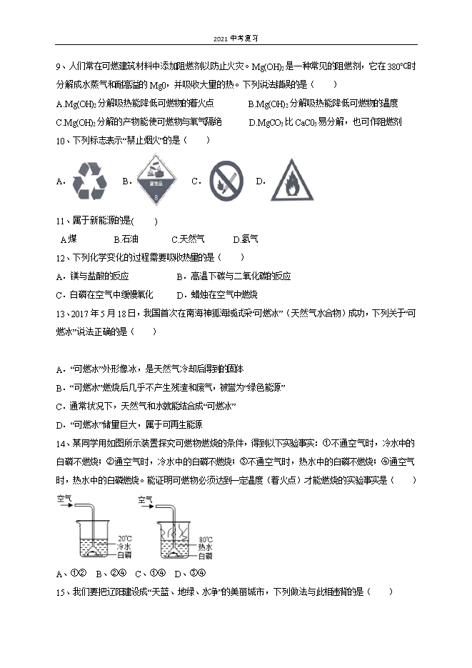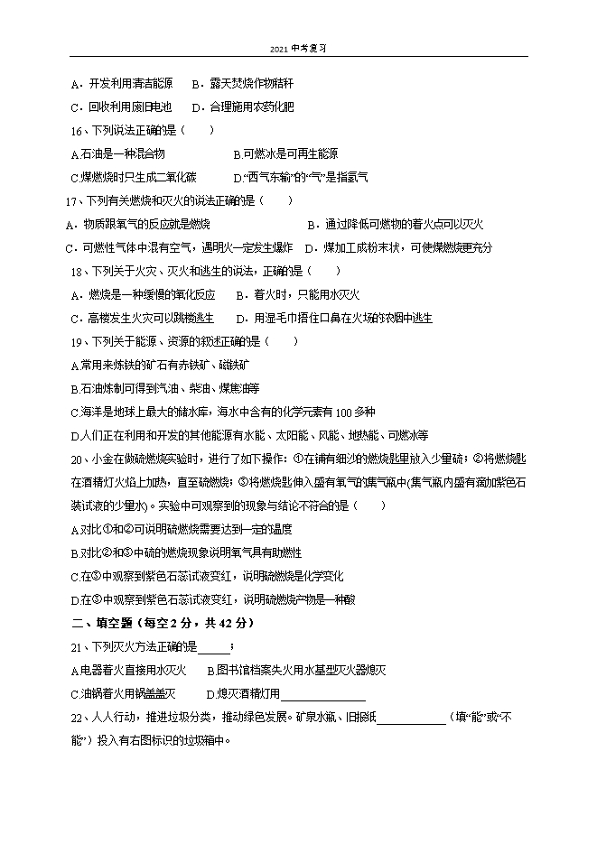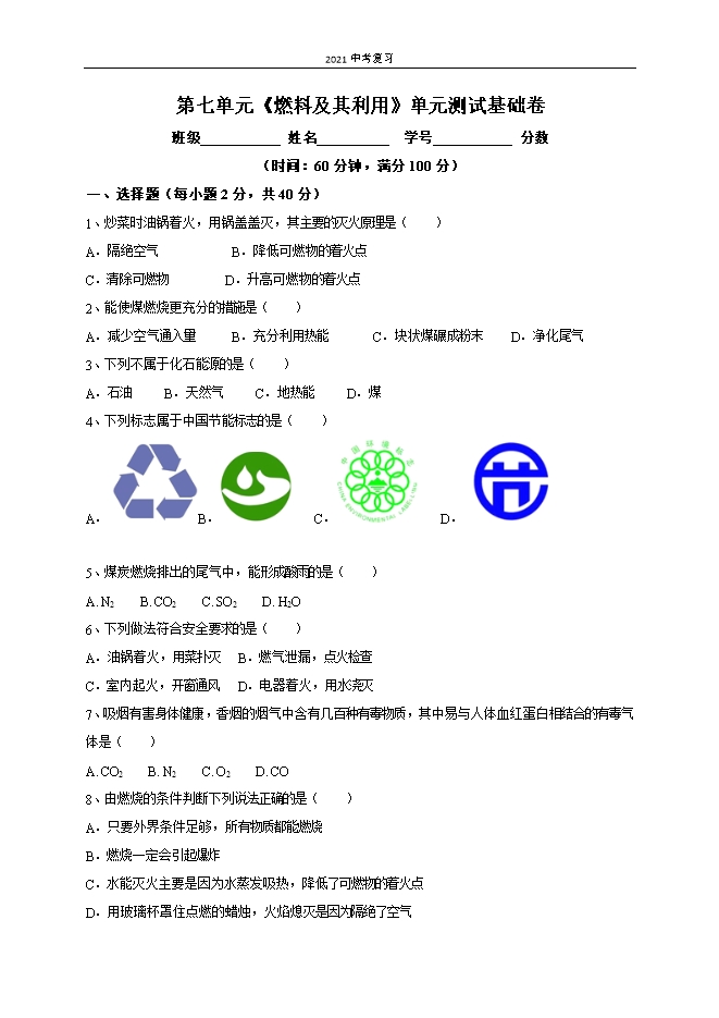 【内容简介】一、选择题(每小题2分,共40分)1、炒菜时油锅着火,用锅盖盖灭,其主要的灭火原理是( )A.隔绝空气 B.降低可燃物的着火点C.清除可燃物 D.升高可燃物的着火点2、能使煤燃烧更充分的措施是( )A.减少空气通入量 B.充分利用热能 C.块状煤碾成粉末 D.净化尾气3、下列不属于化石能源的是( )A.石油 B.天然气 C.地热能 D.煤4、下列标志属于中国节能标志的是( )A. B. C. D. 5、煤炭燃烧排出的尾气中,能形成酸雨的是( )A. N2 B. CO2 C. SO2 D. H2O6、下列做法符合安全要求的是( )A.油锅着火,用菜扑灭B.燃气泄漏,点火检查C.室内起火,开窗通风D.电器着火,用水浇灭7、吸烟有害身体健康,香烟的烟气中含有几百种有毒物质,其中易与人体血红蛋白相结合的有毒气体是( )A. CO2 B. N2 C. O2 D. CO8、由燃烧的条件判断下列说法正确的是( )A.只要外界条件足够,所有物质都能燃烧B.燃烧一定会引起爆炸C.水能灭火主要是因为水蒸发吸热,降低了可燃物的着火点D.用玻璃杯罩住点燃的蜡烛,火焰熄灭是因为隔绝了空气......