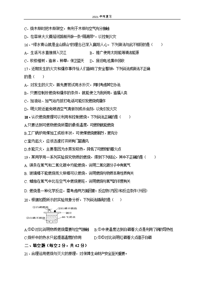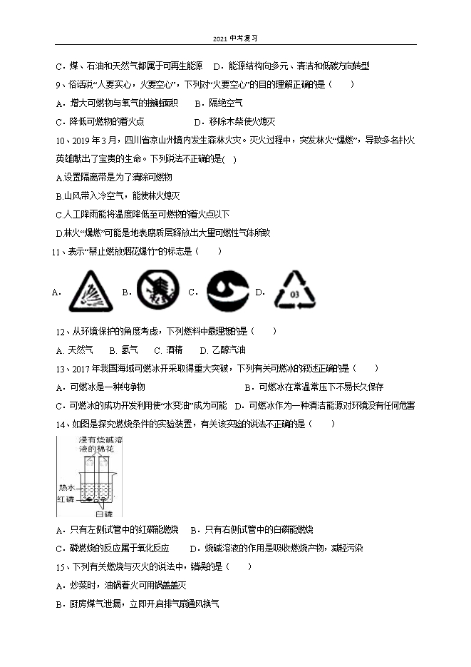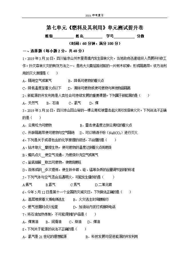 【内容简介】一、选择题(每小题2分,共40分)1、2019年3月30日,四川省凉山州木里县境内发生森林火灾,当地政府迅速组织人员展开扑救工作。扑灭森林火灾的有效方法之一,是将大火蔓延路线前的一片树木砍掉,形成隔离带。该方法利用的灭火原理是( )A.隔绝空气或氧气 B.降低可燃物的着火点C.降低温度至着火点以下 D.清除可燃物或使可燃物与其他物品隔离2、新能源的开发利用是人类社会可持续发展的重要课题。下列属于新能源的是( )A.天然气 B.石油 C.氢气 D.煤3、2019年3月30日,四川凉山因山脊的一棵云南松被雷击起火而引发森林火灾。下列说法不正确的是( )A.云南松为可燃物 B.雷击使温度达到云南松的着火点C.开辟隔离带使可燃物与空气隔绝 D.可以喷洒干粉(NaHCO3)进行灭火4、下列是关于成语包含的化学原理的叙述,不合理的是( )A、钻木取火__摩擦生热,使可燃物的温度达到着火点而燃烧B、煽风点火__使空气流通,为燃烧补充空气或氧气C、釜底抽薪__取出可燃物,使燃烧更旺D、百炼成钢__多次提炼,使生铁中碳、硅、锰等杂质的含量调节至钢的标准5、下列气体与空气混合后遇明火,可能发生爆炸的是( )A.氨气 B.氢气 C.氮气 D.二氧化碳6、今年5月12日是第十一个全国防灾减灾日,下列做法正确的是( )A.高层楼房着火乘电梯逃生 B.火灾逃生时弯腰前行C.燃气泄漏时点火检查 D.加油站内拨打或接听电话7、将石油加热炼制,不可能得到的产品是( )A.煤焦油 B.润滑油 C.柴油 D.煤油8、下列关于能源的说法不正确的是( )A.氢气是21世纪的理想能源 B.科技发展可促进能源的开发利用C.煤、石油和天然气都属于可再生能源 D.能源结构向多元、清洁和低碳方向转型9、俗话说“人要实心,火要空心”,下列对“火要空心”的目的理解正确的是( )A.增大可燃物与氧气的接触面积 B.隔绝空气C.降低可燃物的着火点 D.移除木柴使火熄灭10、2019年3月,四川省凉山州境内发生森林火灾。灭火过程中,突发林火“爆燃”,导致多名扑火英雄献出了宝贵的生命。下列说法不正确的是( )A.设置隔离带是为了清除可燃物B.山风带入冷空气,能使林火熄灭C.人工降雨能将温度降低至可燃物的着火点以下D.林火“爆燃”可能是地表腐质层释放出大量可燃性气体所致......