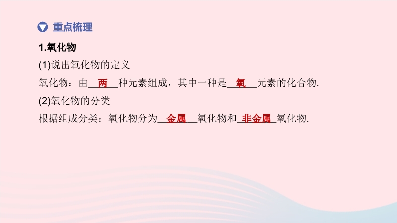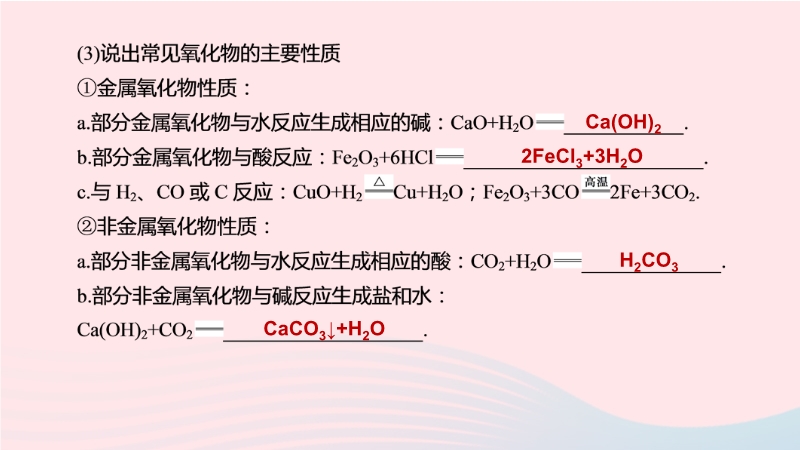 【内容简介】1.氧化物(1)说出氧化物的定义氧化物:由 种元素组成,其中一种是 元素的化合物. (2)氧化物的分类根据组成分类:氧化物分为 氧化物和 氧化物. (3)说出常见氧化物的主要性质①金属氧化物性质: a.部分金属氧化物与水反应生成相应的碱:CaO+H2O . b.部分金属氧化物与酸反应:Fe2O3+6HCl . c.与H2、CO或C反应:CuO+H2 Cu+H2O;Fe2O3+3CO 2Fe+3CO2.②非金属氧化物性质: a.部分非金属氧化物与水反应生成相应的酸:CO2+H2O . b.部分非金属氧化物与碱反应生成盐和水:Ca(OH)2+CO2 . ......