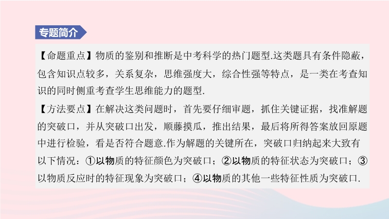【内容简介】【命题重点】物质的鉴别和推断是中考科学的热门题型.这类题具有条件隐蔽,包含知识点较多,关系复杂,思维强度大,综合性强等特点,是一类在考查知识的同时侧重考查学生思维能力的题型.【方法要点】在解决这类问题时,首先要仔细审题,抓住关键证据,找准解题的突破口,并从突破口出发,顺藤摸瓜,推出结果,最后将所得答案放回原题中进行检验,看是否符合题意.作为解题的关键所在,突破口归纳起来大致有以下情况:①以物质的特征颜色为突破口;②以物质的特征状态为突破口;③以物质反应时的特征现象为突破口;④以物质的其他一些特征性质为突破口.......