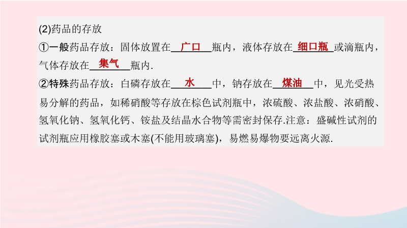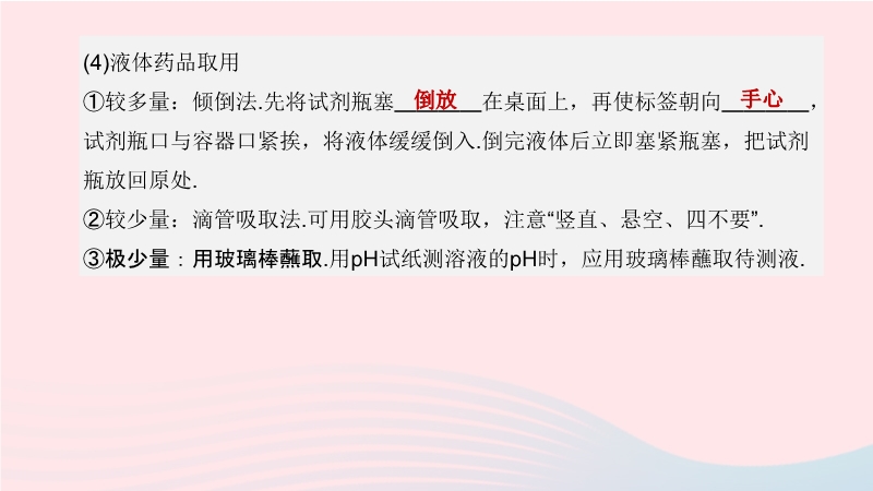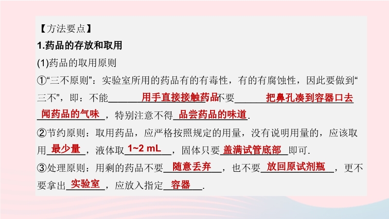 【内容简介】【方法要点】1.药品的存放和取用(1)药品的取用原则①“三不原则”:实验室所用的药品有的有毒性,有的有腐蚀性,因此要做到“三不”,即:不能 ,不要______________________ ,特别注意不得 . ②节约原则:取用药品,应严格按照规定的用量,没有说明用量的,应该取用 ,液体取 ,固体只要 即可. ③处理原则:用剩的药品不要 ,也不要 ,更不要拿出 ,应放入指定 . (2)药品的存放①一般药品存放:固体放置在 瓶内,液体存放在 或滴瓶内,气体存放在 瓶内. ②特殊药品存放:白磷存放在 中,钠存放在 中,见光受热易分解的药品,如稀硝酸等存放在棕色试剂瓶中,浓硫酸、浓盐酸、浓硝酸、氢氧化钠、氢氧化钙、铵盐及结晶水合物等需密封保存.注意:盛碱性试剂的试剂瓶应用橡胶塞或木塞(不能用玻璃塞),易燃易爆物要远离火源. ......