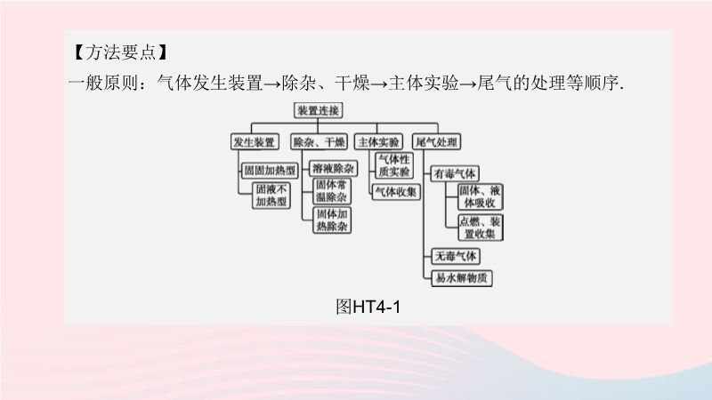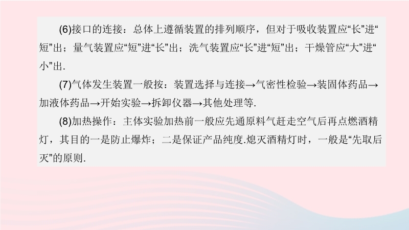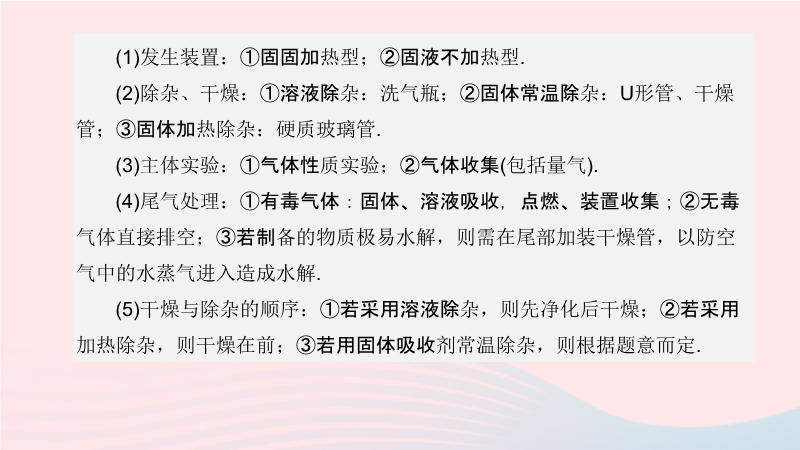【内容简介】(1)发生装置:①固固加热型;②固液不加热型.(2)除杂、干燥:①溶液除杂:洗气瓶;②固体常温除杂:U形管、干燥管;③固体加热除杂:硬质玻璃管.(3)主体实验:①气体性质实验;②气体收集(包括量气).(4)尾气处理:①有毒气体:固体、溶液吸收,点燃、装置收集;②无毒气体直接排空;③若制备的物质极易水解,则需在尾部加装干燥管,以防空气中的水蒸气进入造成水解.(5)干燥与除杂的顺序:①若采用溶液除杂,则先净化后干燥;②若采用加热除杂,则干燥在前;③若用固体吸收剂常温除杂,则根据题意而定.(6)接口的连接:总体上遵循装置的排列顺序,但对于吸收装置应“长”进“短”出;量气装置应“短”进“长”出;洗气装置应“长”进“短”出;干燥管应“大”进“小”出.(7)气体发生装置一般按:装置选择与连接→气密性检验→装固体药品→加液体药品→开始实验→拆卸仪器→其他处理等.(8)加热操作:主体实验加热前一般应先通原料气赶走空气后再点燃酒精灯,其目的一是防止爆炸;二是保证产品纯度.熄灭酒精灯时,一般是“先取后灭”的原则.......