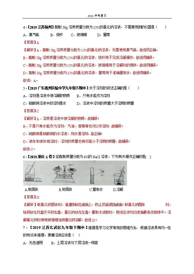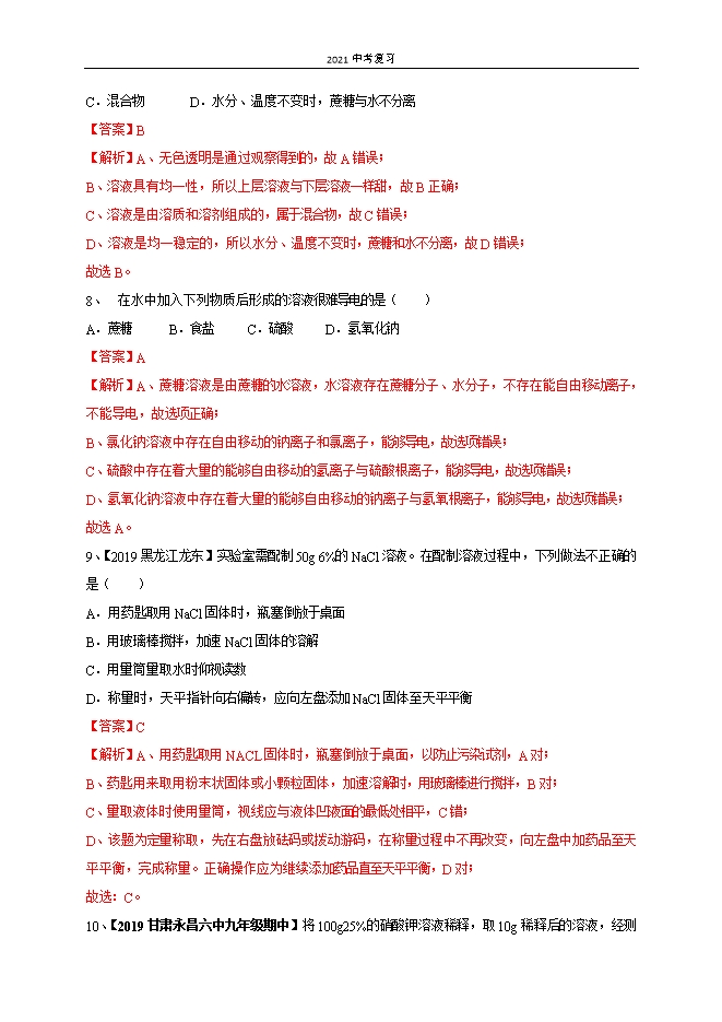 【内容简介】一、选择题(每小题2分,共40分)1、下列物质不属于溶液的是( )A.生理盐水 B.白醋 C.医用酒精 D.冰水混合物 【答案】D【解析】A、生理盐水是均一稳定的混合物,属于溶液,故A错;B、白醋是均一稳定的混合物,属于溶液,故B错;C、医用酒精均一稳定的混合物,属于溶液,故C错;D、冰水混合物是由水一种物质组成,属于纯净物,不是溶液,故D正确。故选:D。2、下列物质溶解或稀释过程中,溶液温度没有明显改变的是( )A.NaOH B.NH4NO3 C.浓硫酸 D.NaCl 【答案】D【解析】A、氢氧化钠溶于水放热,溶液温度升高,故A错误;B、硝酸铵溶于水吸收热量,溶液温度明显降低,故B错误;C、浓硫酸加到水中放热,溶液温度升高,故C错误;D、氯化钠溶于水既不吸热也不放热,温度基本保持不变。故D正确。故选:D。3、利用下列物质清洗油污时.发生乳化现象的是( )A.汽油B.洗涤剂C.纯碱溶液D.烧碱溶液【答案】B【解析】A、汽油清洗油污属于溶解过程,故A错误 ;B、加入洗涤剂的水清洗油污时,可以使油污以细小的液滴均匀的分散在水中,形成乳浊液,这种现象叫做乳化作用,故B正确;C、碳酸钠溶液清洗油污属于溶解过程,故C错误;D、氢氧化钠溶液清洗油污属于溶解过程,故D错误。......